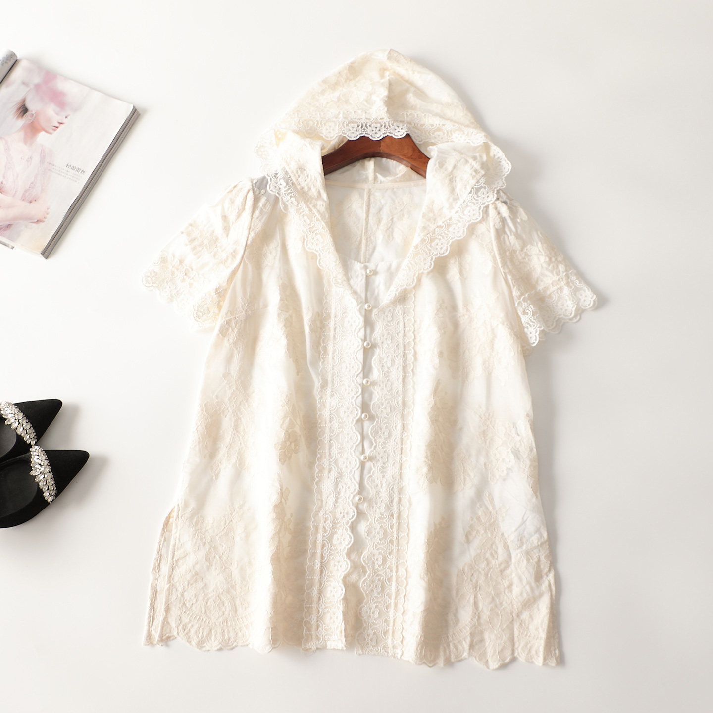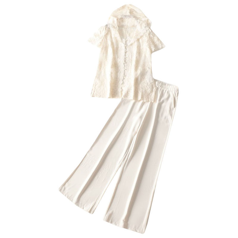 411843 夏天丝上衣裤子套装 女长款短袖连帽现货