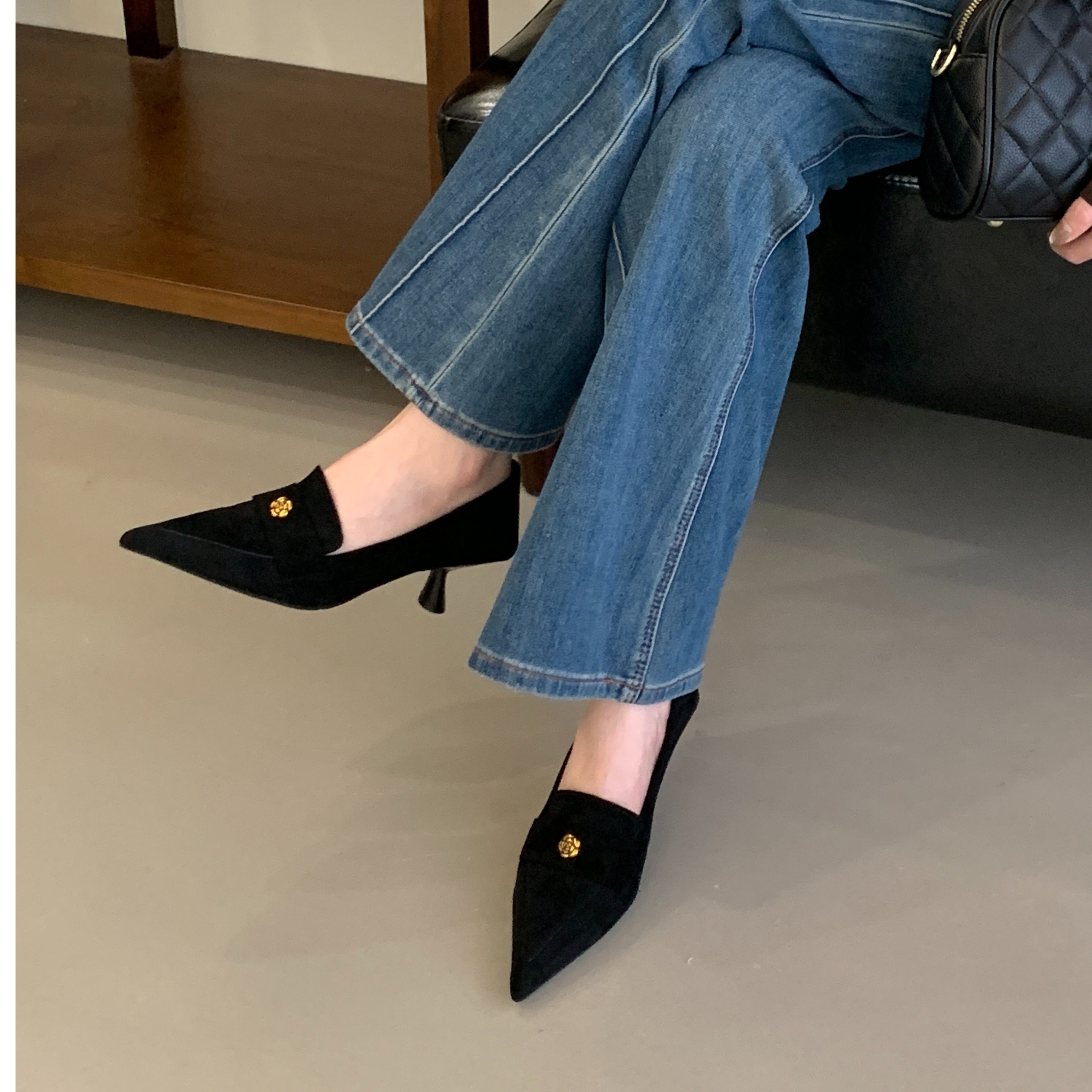 浅口复古尖头单鞋金属扣