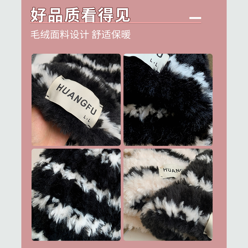 条纹毛绒帽子女秋冬季显脸小毛茸茸毛线帽大头围保暖黑色针织帽潮