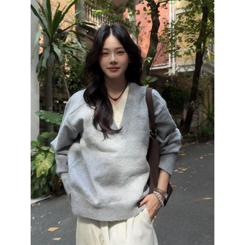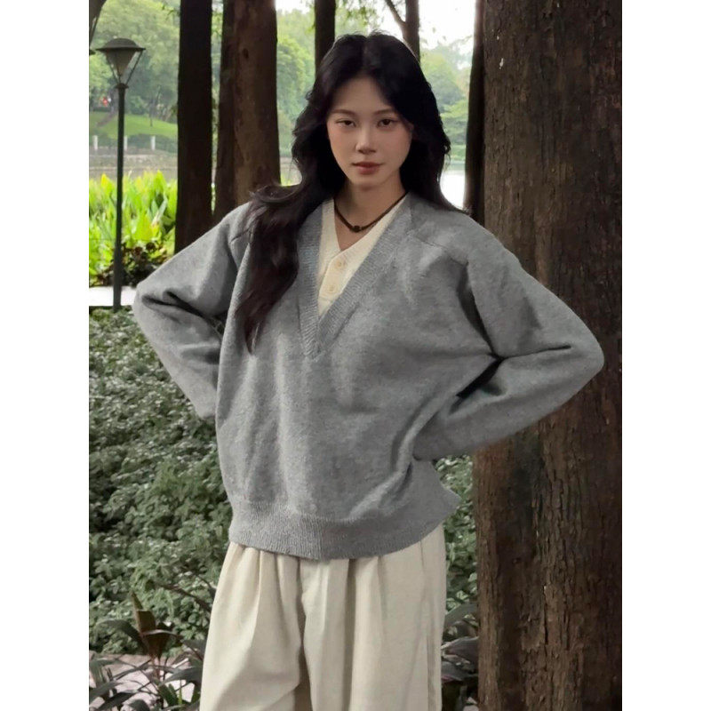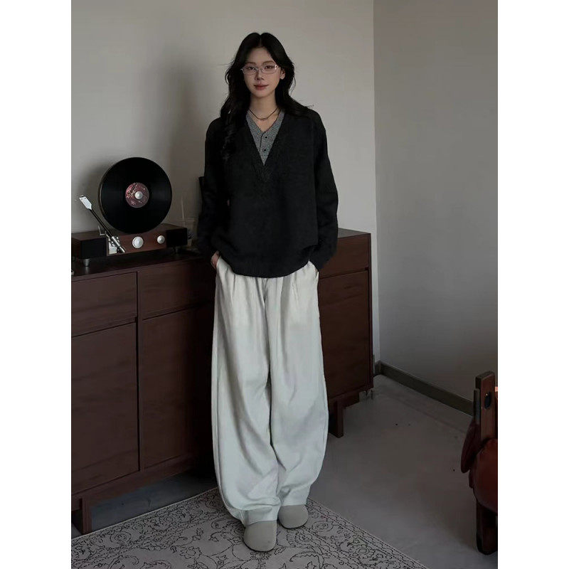 老钱风新贵v领假两件毛衣男秋季高级感慵懒风针织衫黑色情侣外套