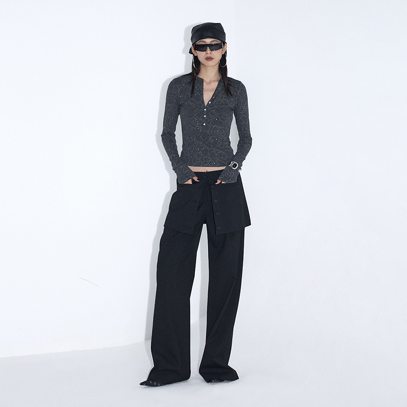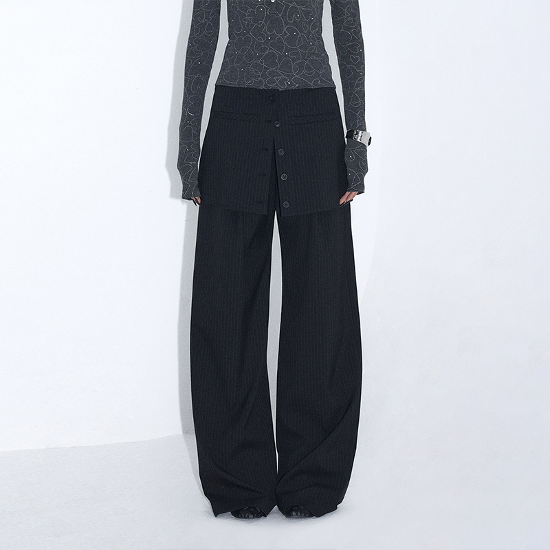 ourhour 假两件拼接 黑白条纹裙帘宽松弯刀西装裤 女秋设计感长裤