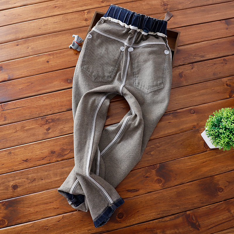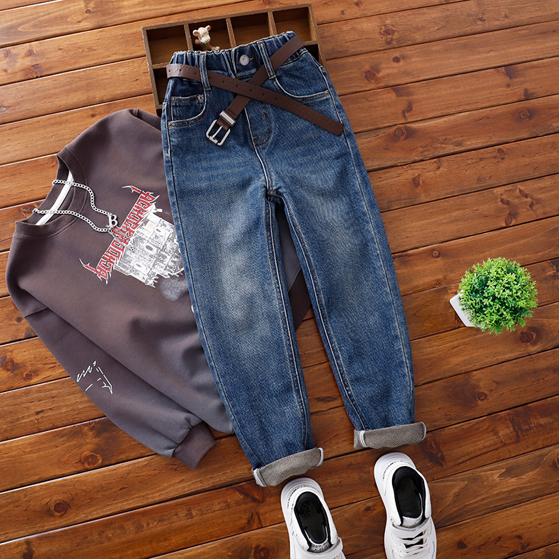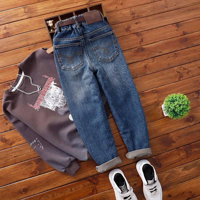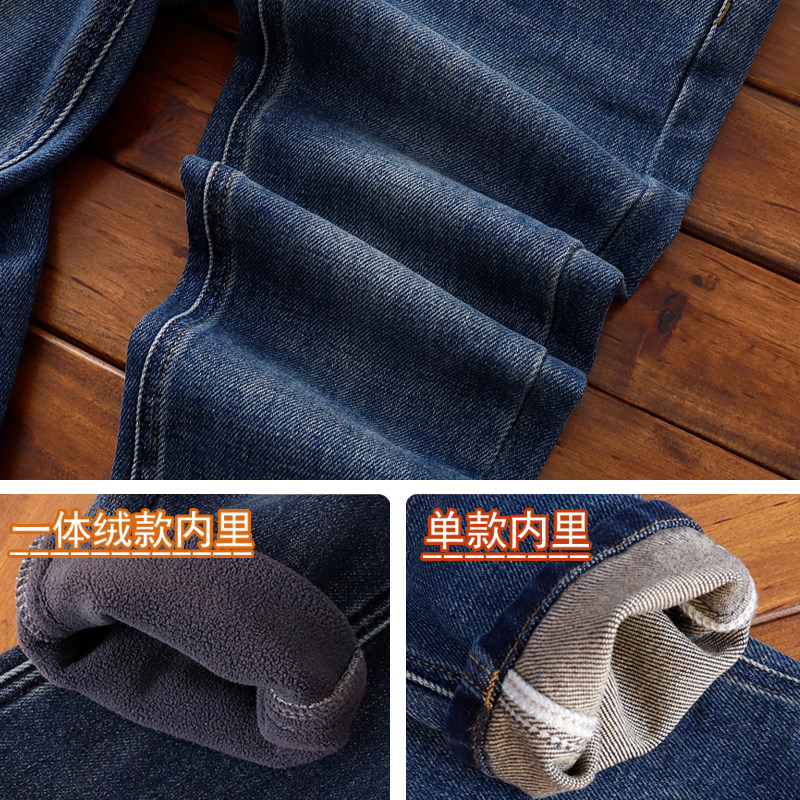 男童蓝色瘦版牛仔裤中大童秋冬裤子儿童柔软一体绒修身小脚裤长裤
