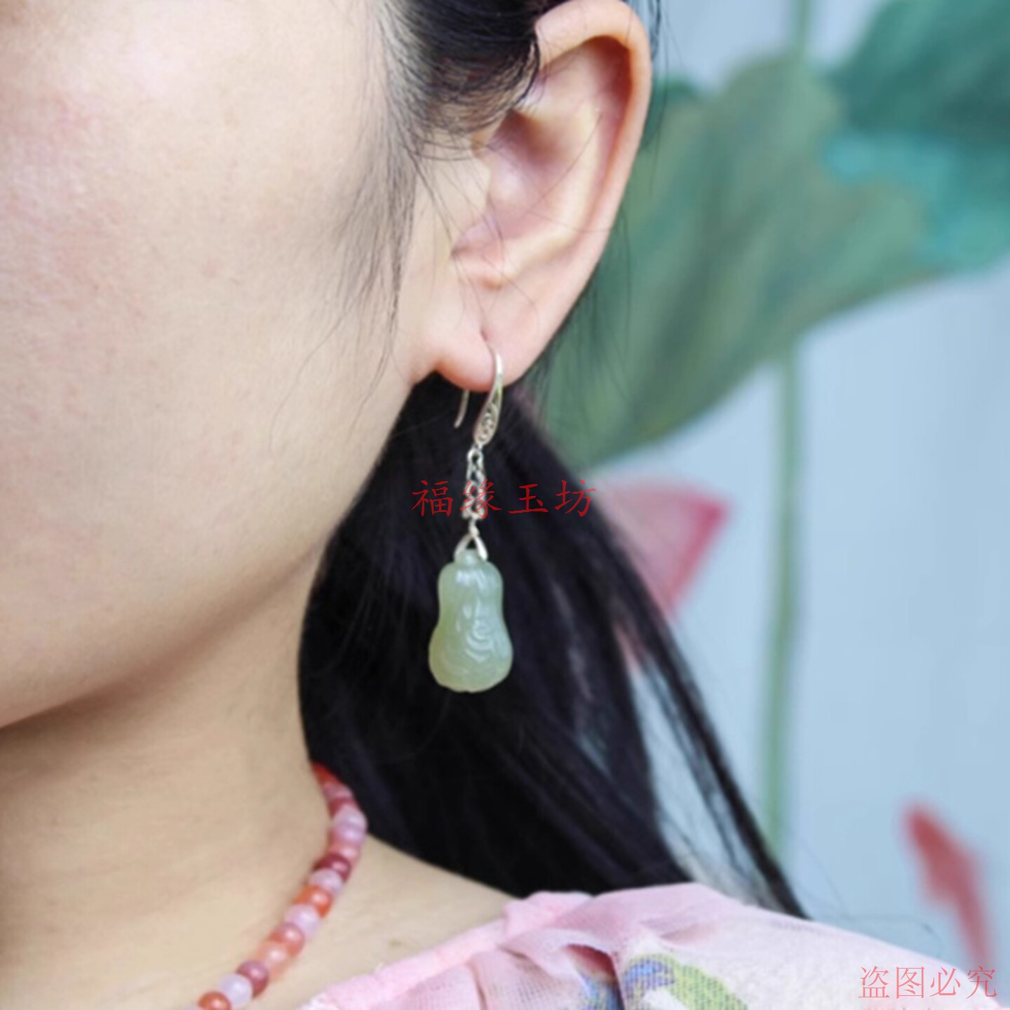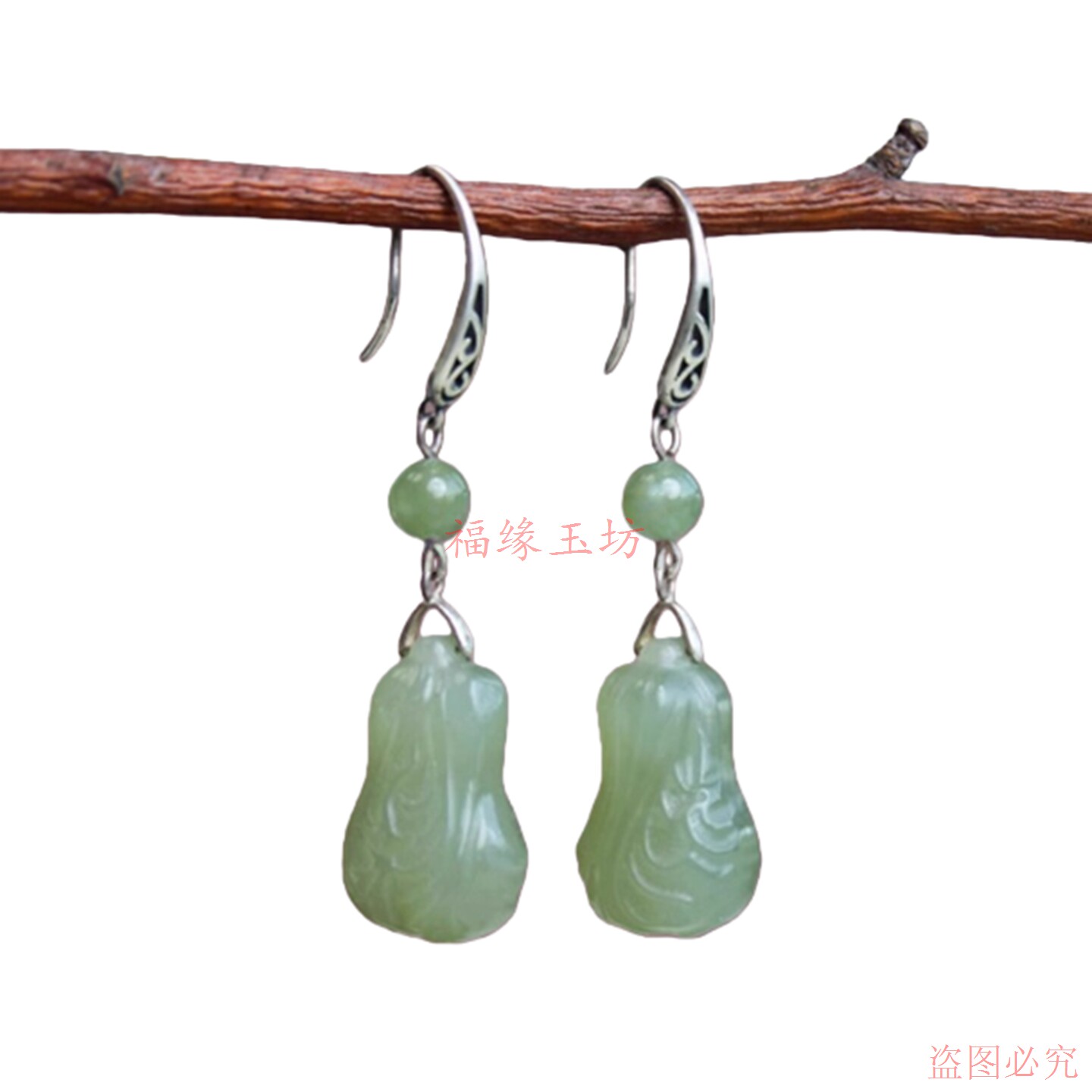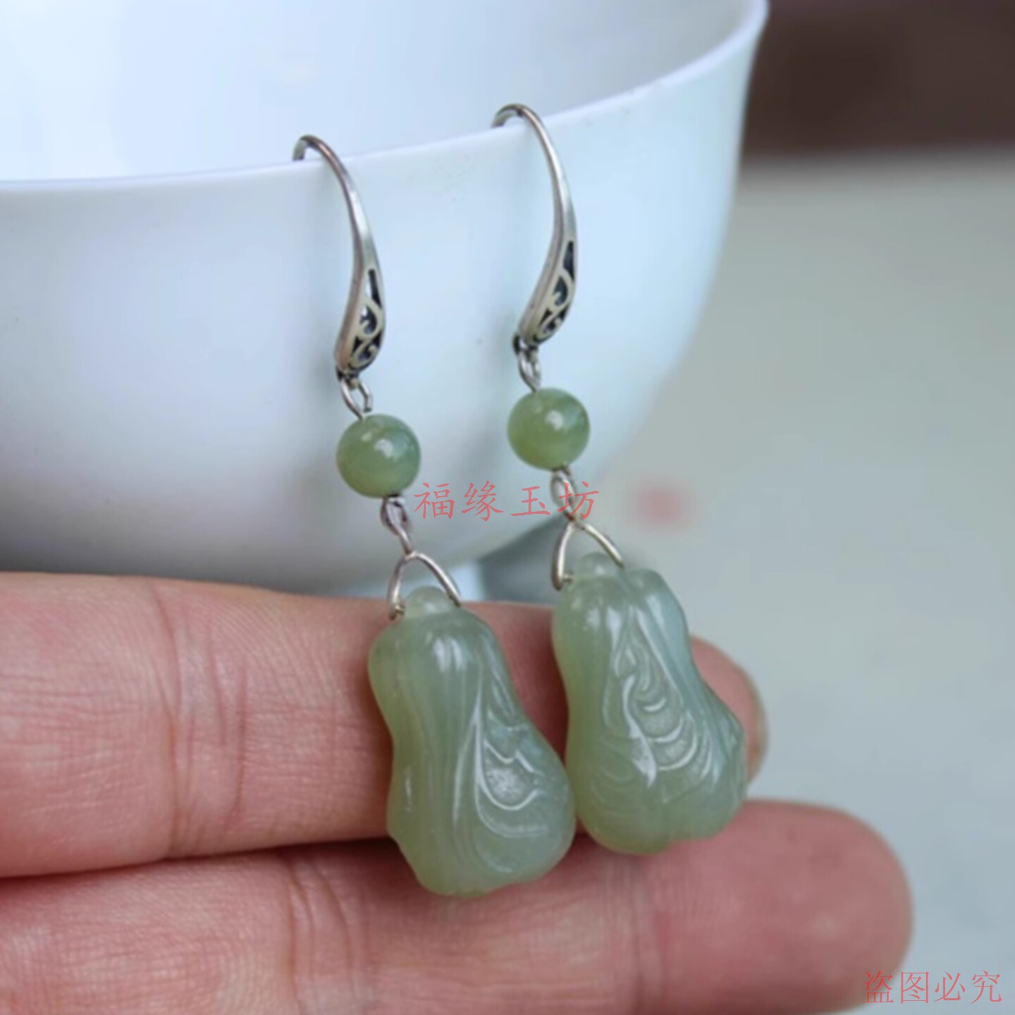 新款和田湖水绿白菜耳坠镂空耳钩