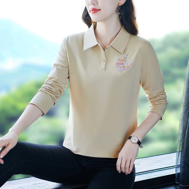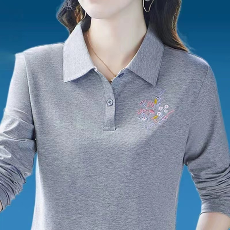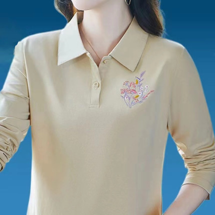 2025春秋新款长袖t恤女早秋气质翻领减龄妈妈刺绣百搭宽松polo衫
