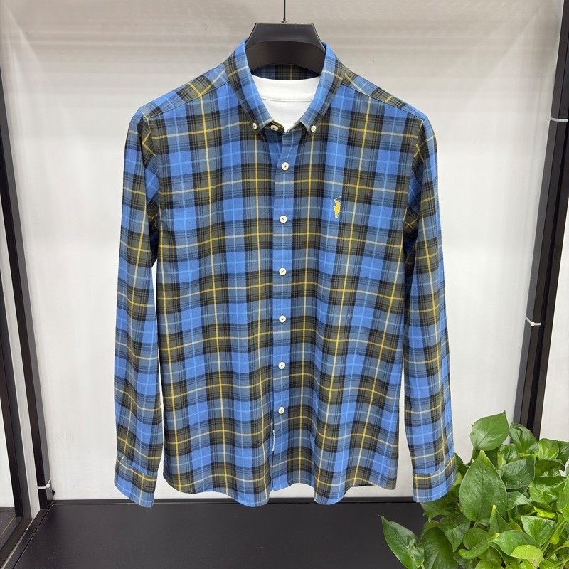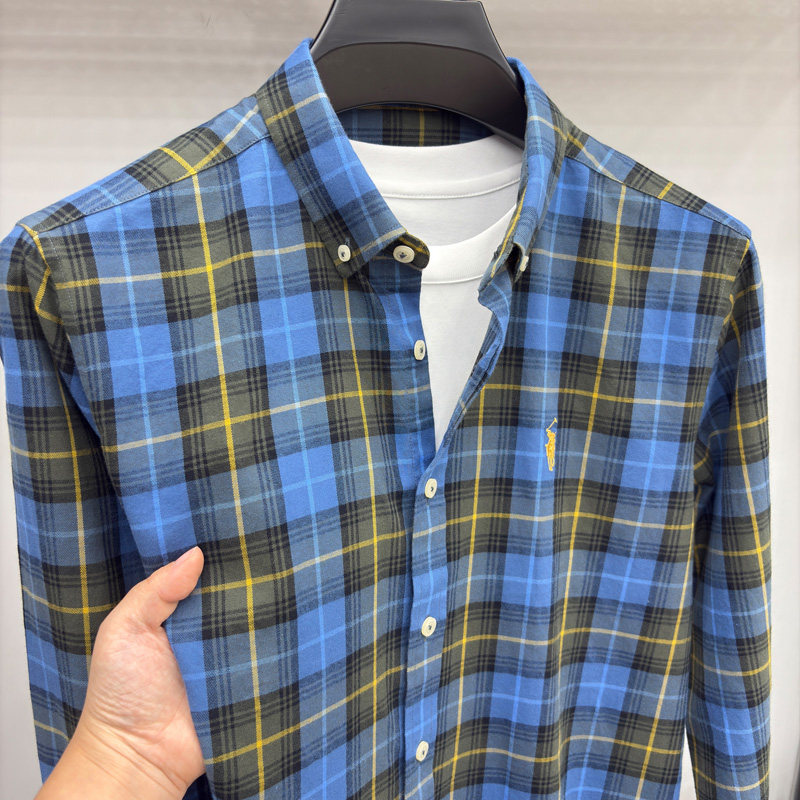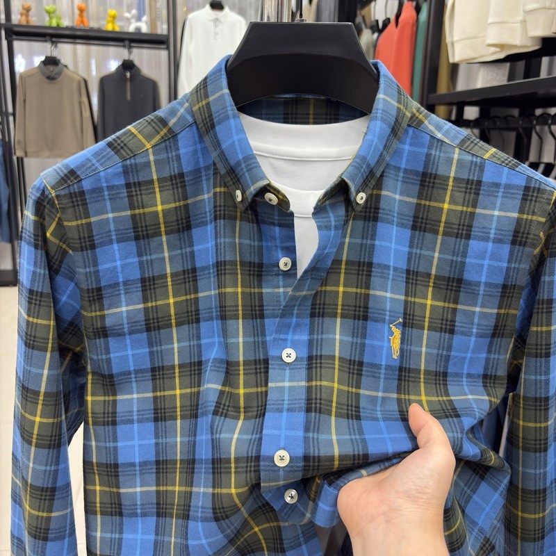 保罗刺绣全棉长袖衬衫男春秋新款格子衬衣男士休闲宽松上衣商务男