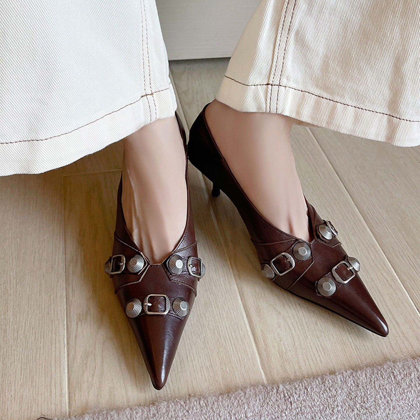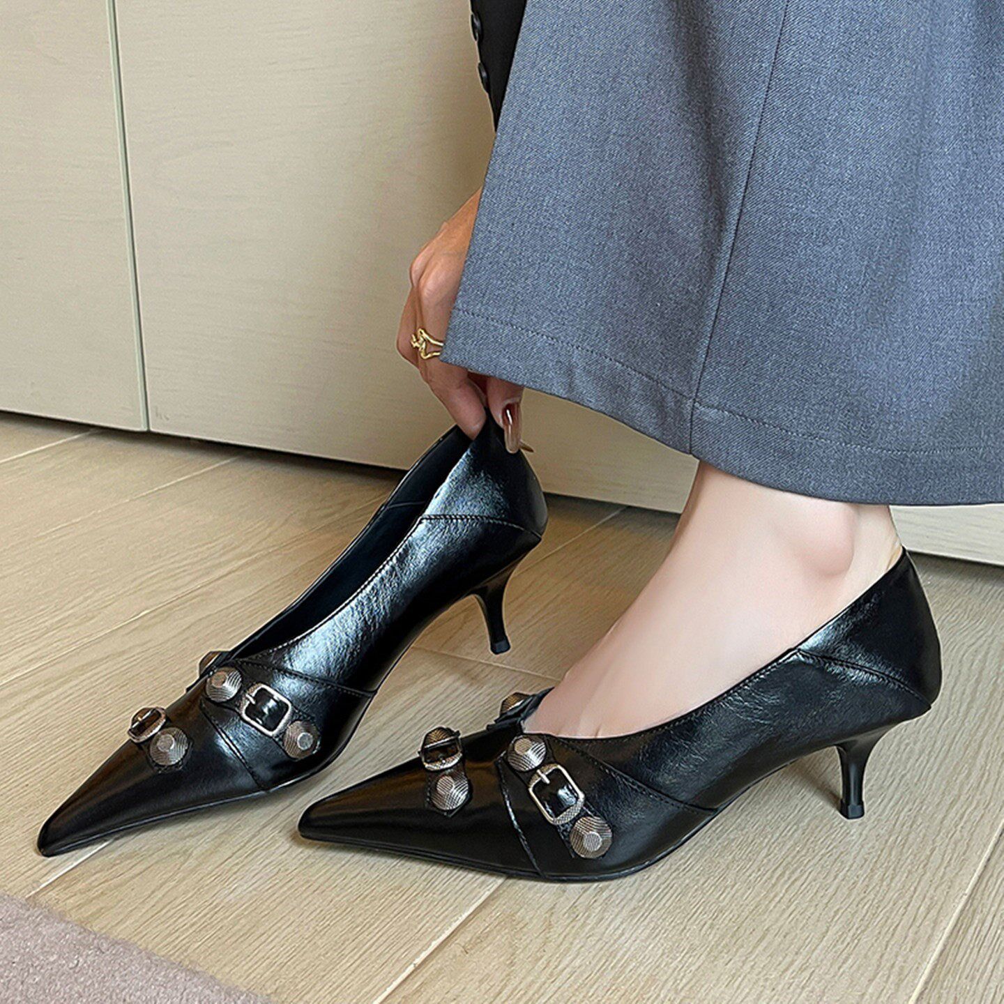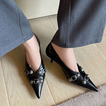 老钱风真皮法式气质尖头浅口优雅细跟铆钉皮带扣高跟鞋黑色单鞋女