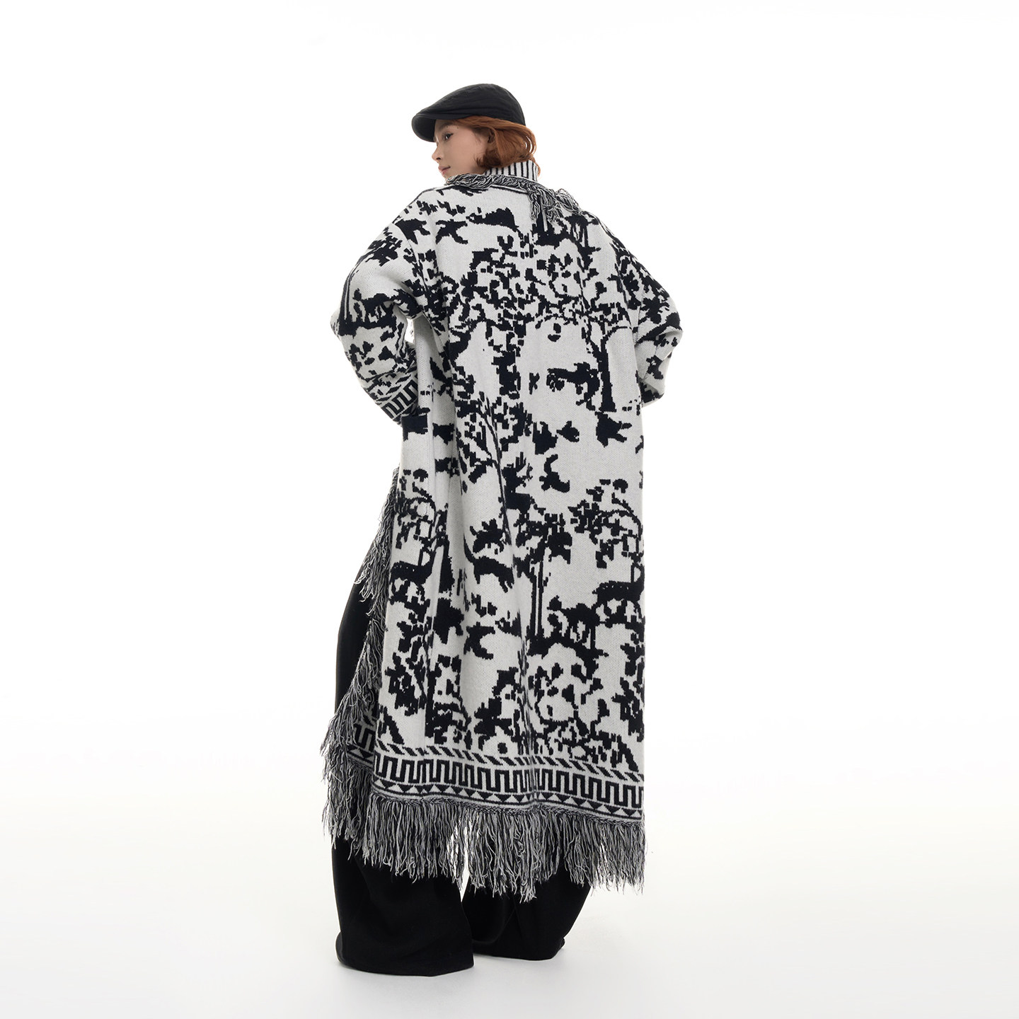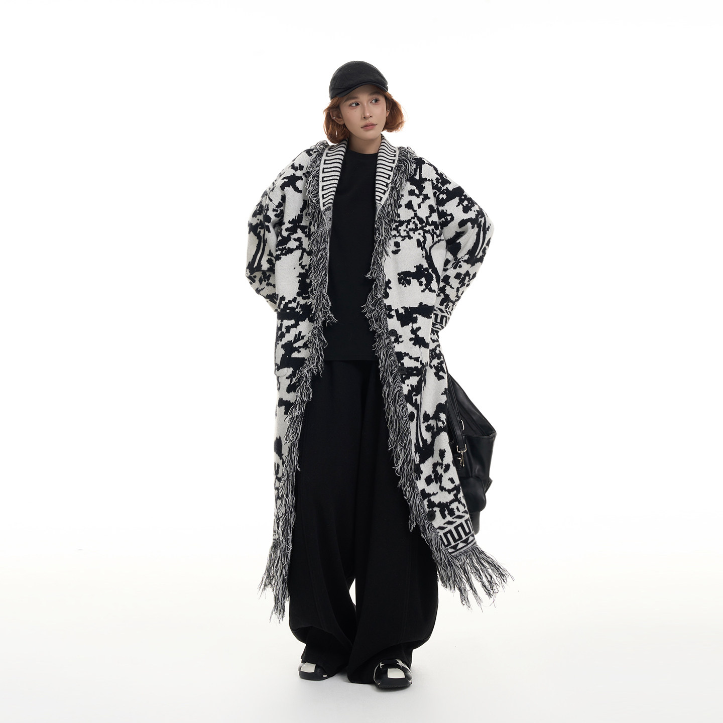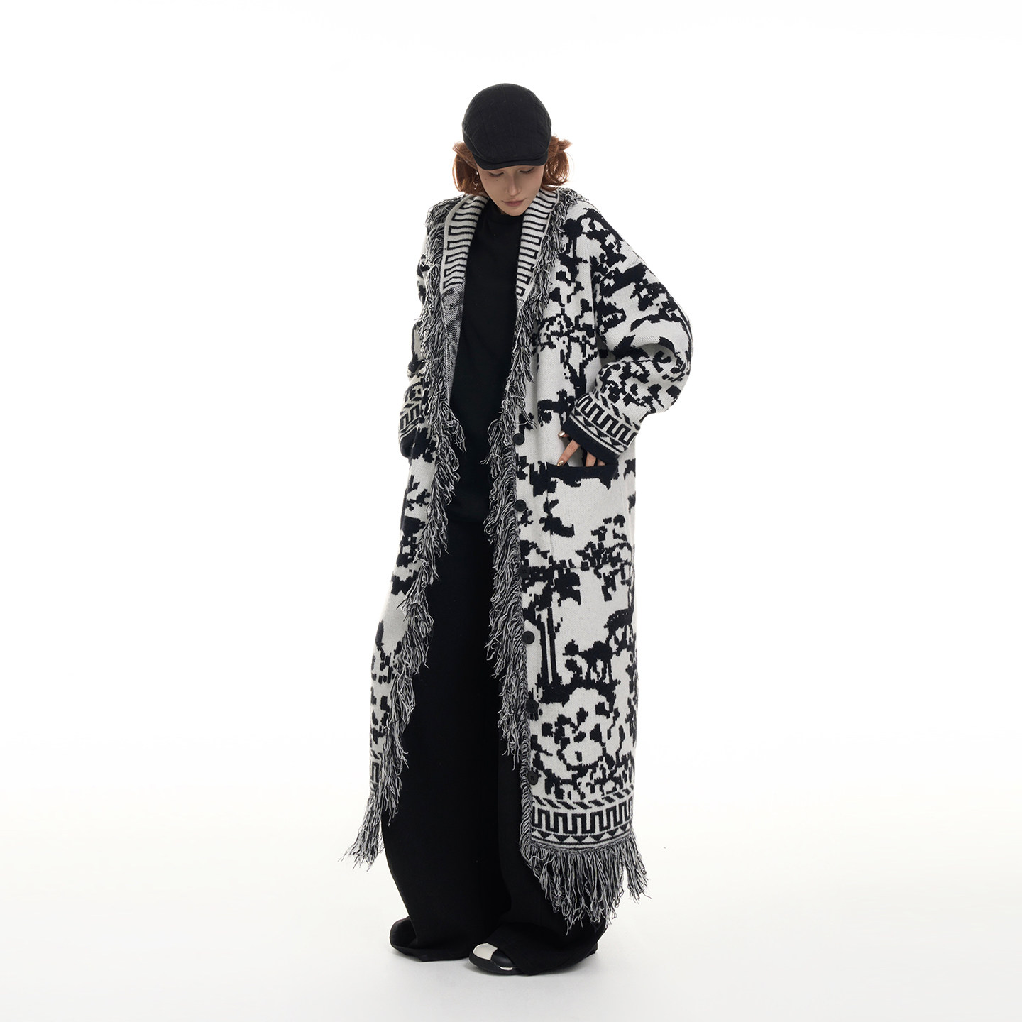 吴童童流苏提花长袖针织毛衣外套女秋冬韩系慵懒宽松开衫长款上衣