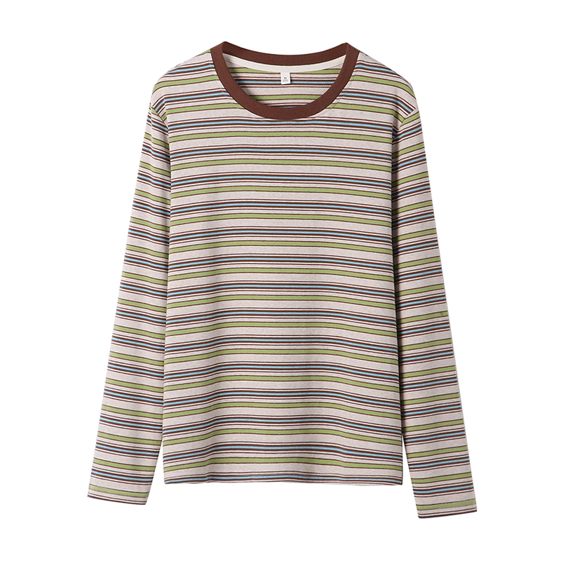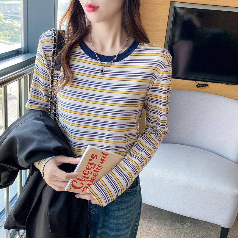 复古条纹长袖T恤女冬季新款大码显瘦正肩打底衫百搭减龄上衣服秋
