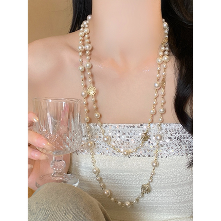 法式山茶花珍珠项链女大气高档高级感毛衣链2025新款双层叠戴配饰
