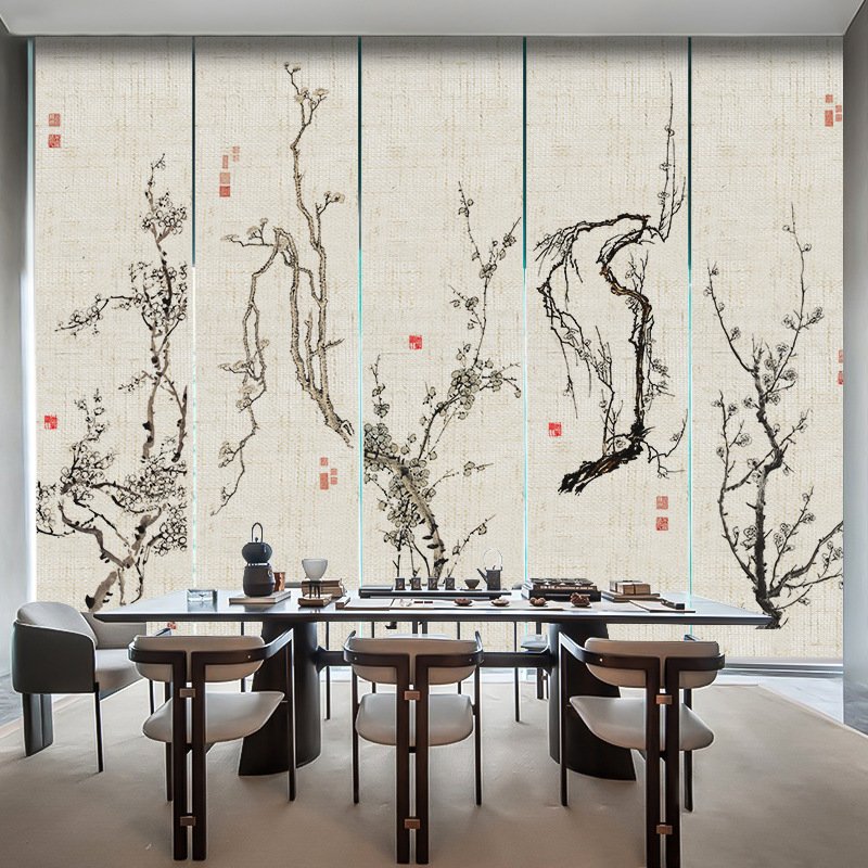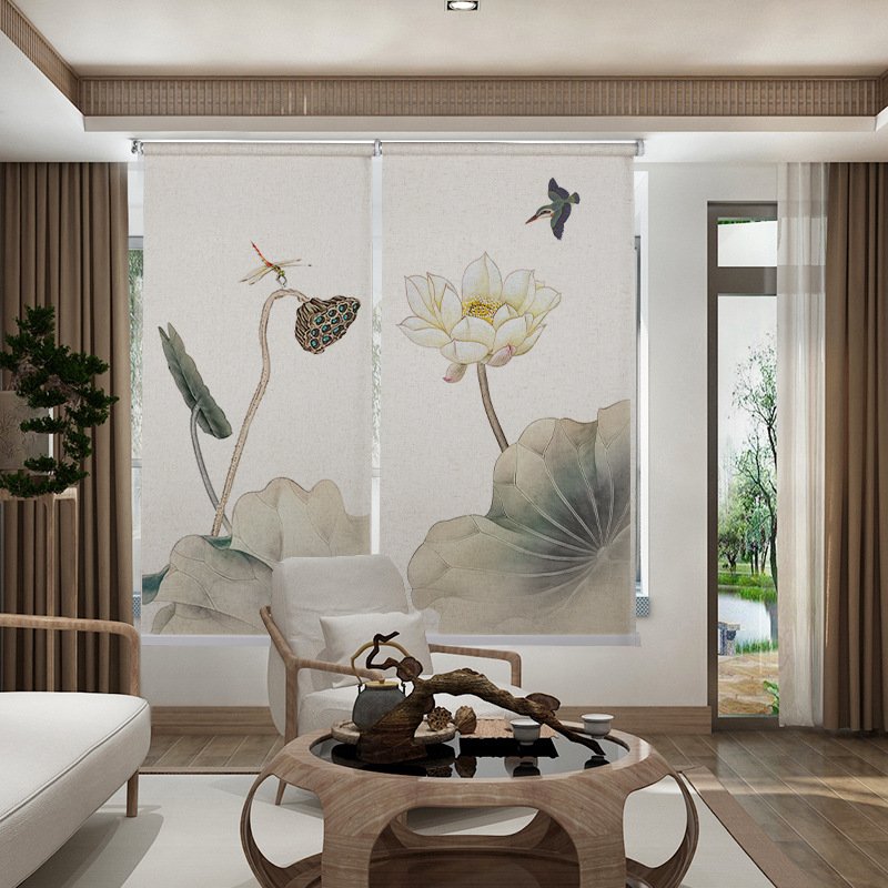 隔断帘升降卷帘印花玄关书房茶室名宿客栈电动手动背景窗帘仿亚麻