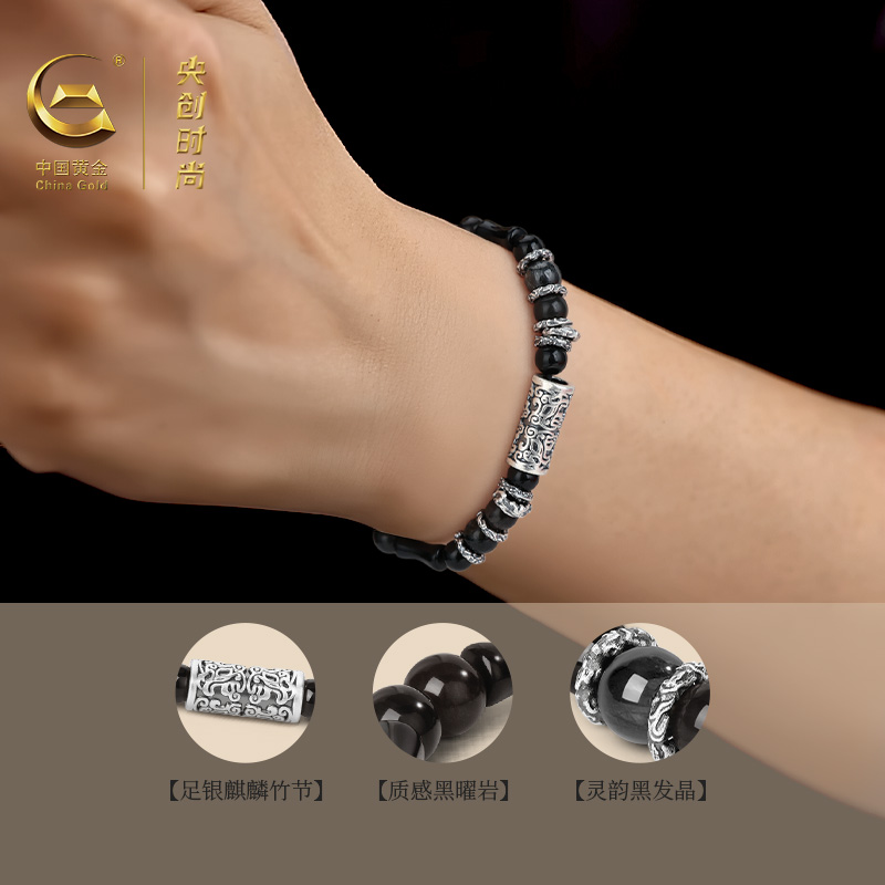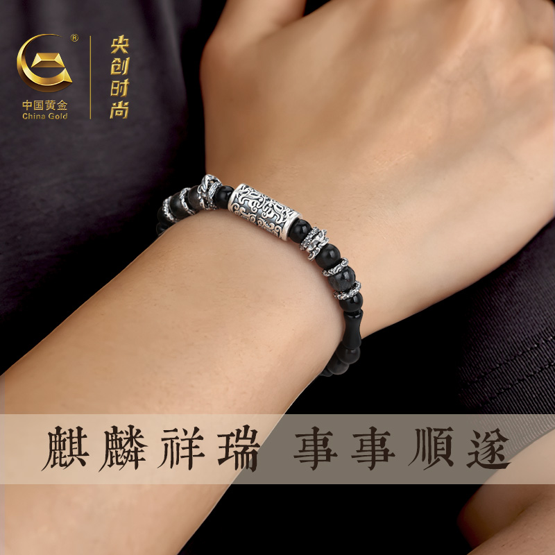 中国黄金央创足银黑曜石手串麒麟竹节手链男款转运生日礼物送男友