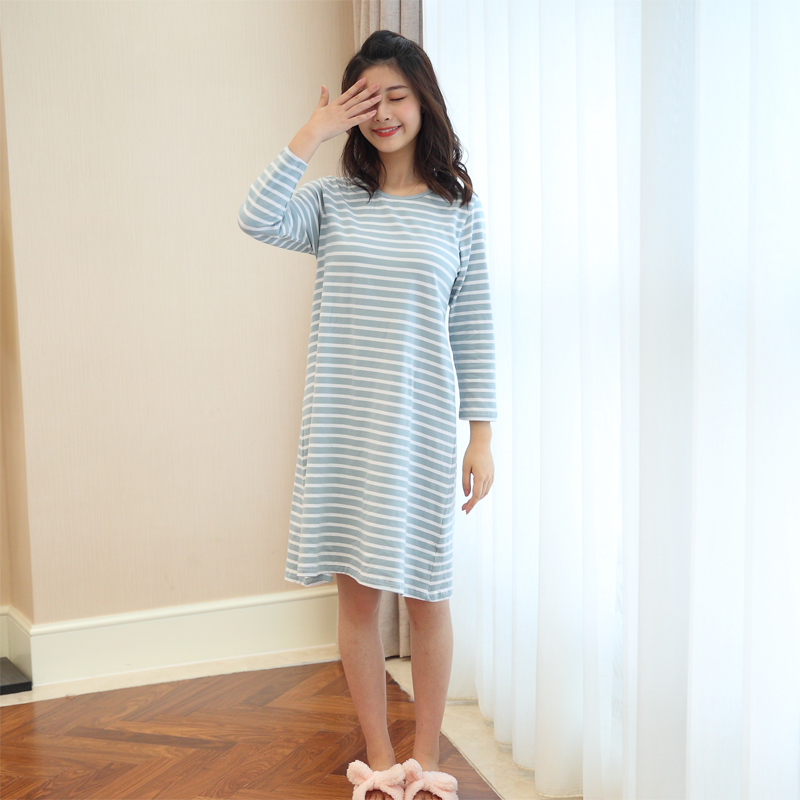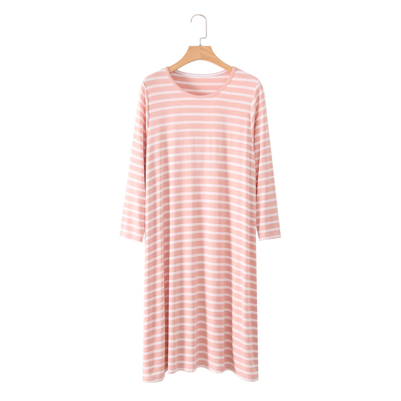 秋冬莫代尔纯棉女九分袖睡裙中长裙宽松加大码长袖条纹睡衣家居服