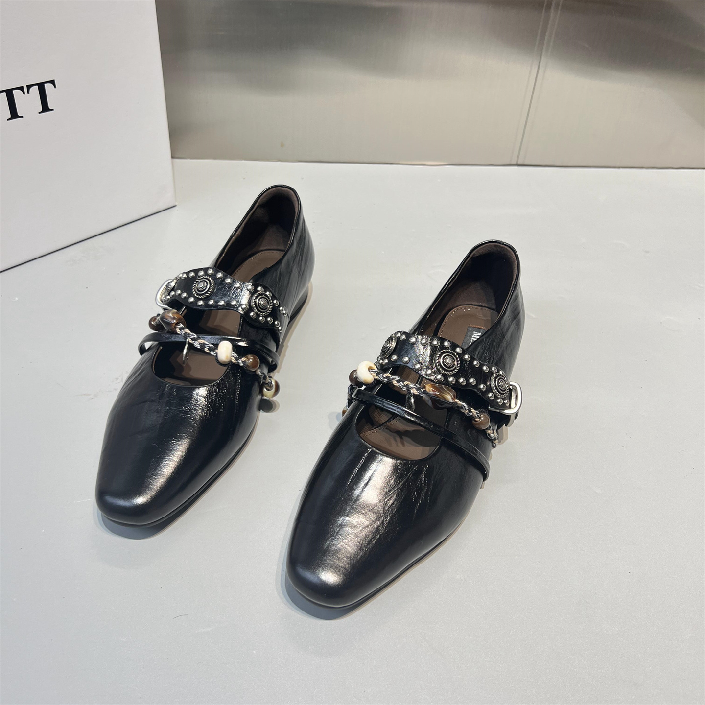 欧洲站女鞋2025秋新款欧货真皮铆钉一字带平底浅口单鞋玛丽珍鞋潮
