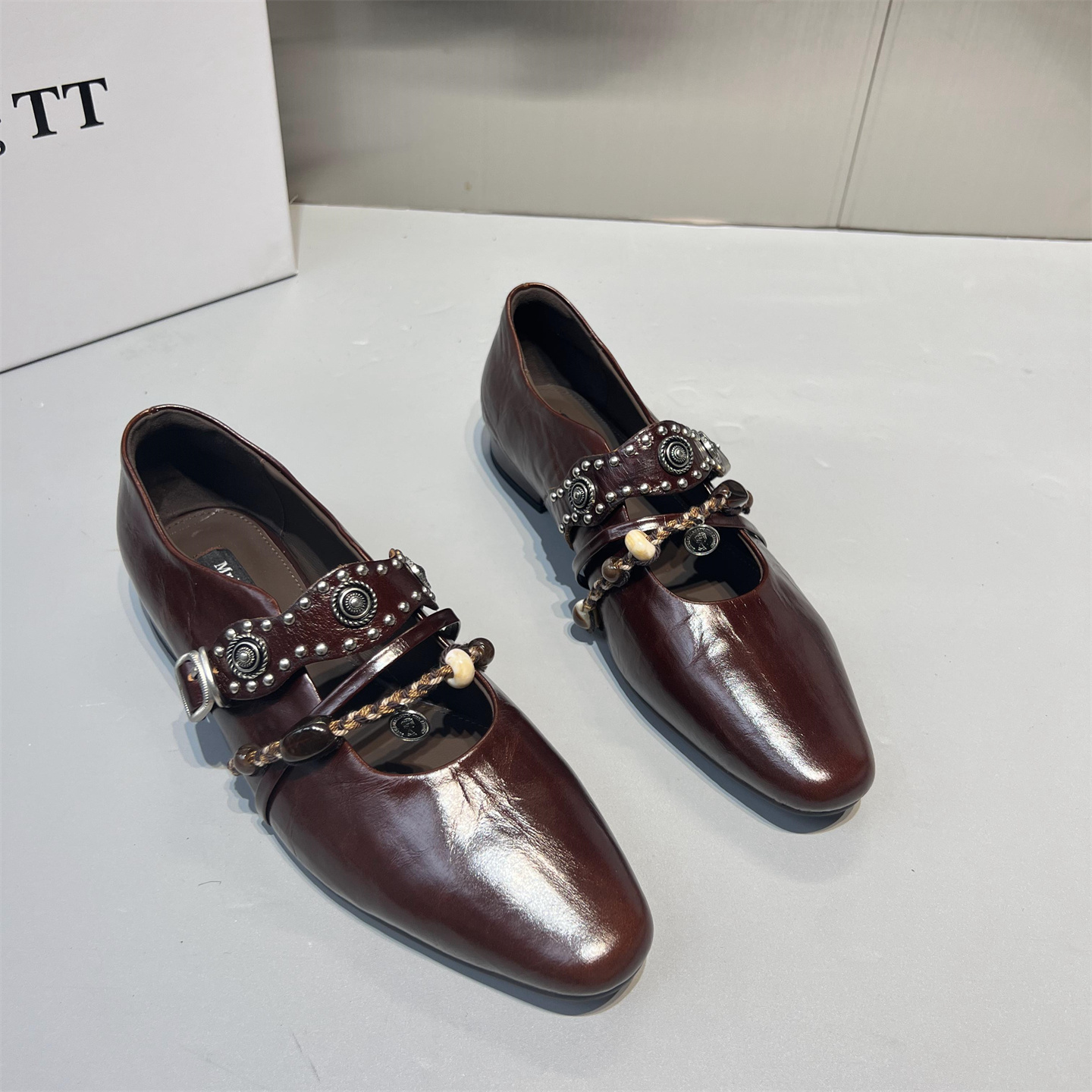 真皮铆钉一字带平底单鞋玛丽珍鞋