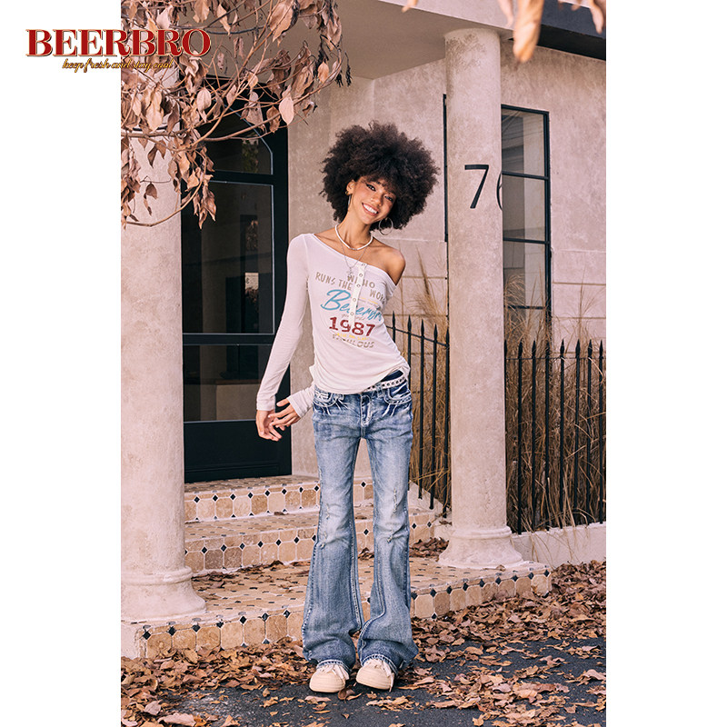 BeerBro 美式辣妹复古重工绣花洗水牛仔裤女弹力微喇显瘦长裤新款