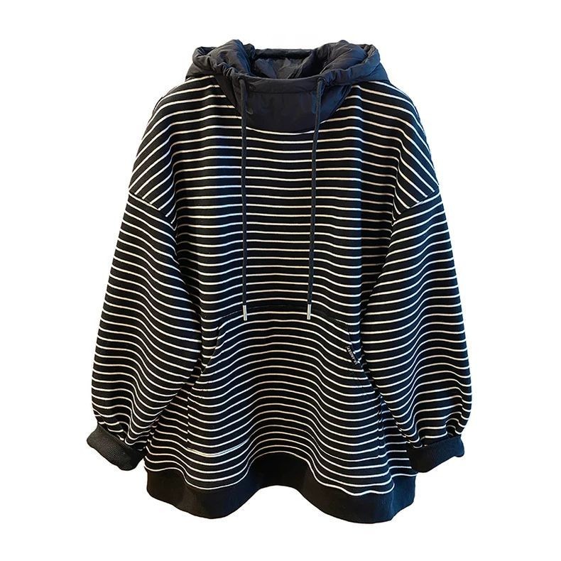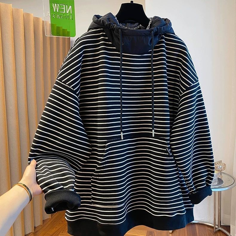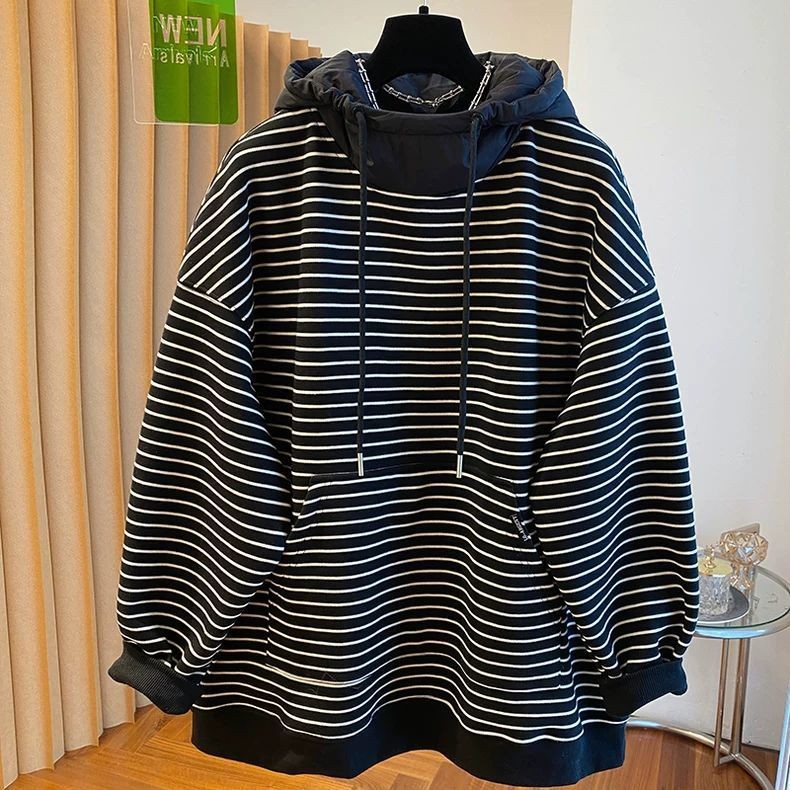 胖MM特大码300斤条纹连帽休闲卫衣女秋冬加绒宽松显瘦套头上衣ins