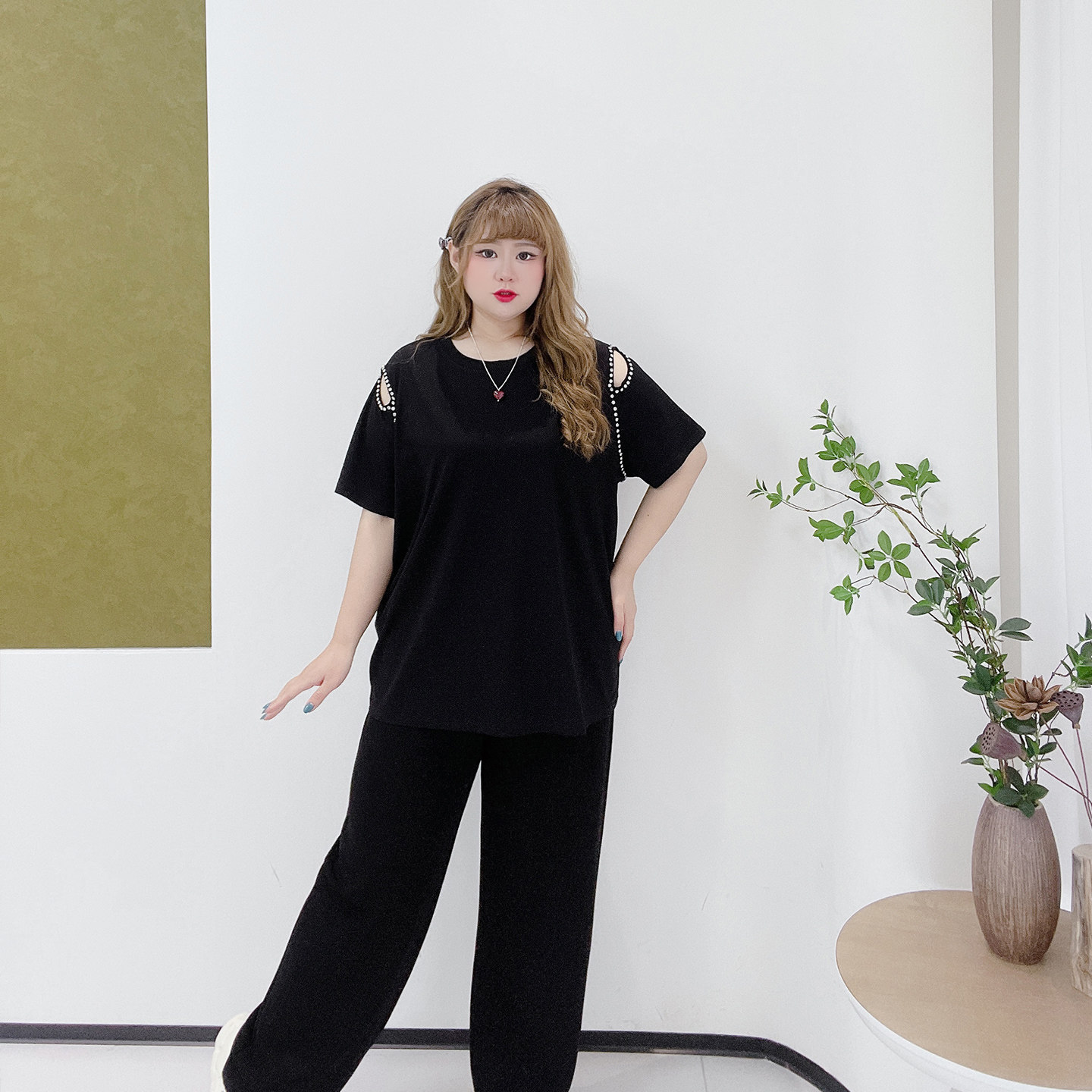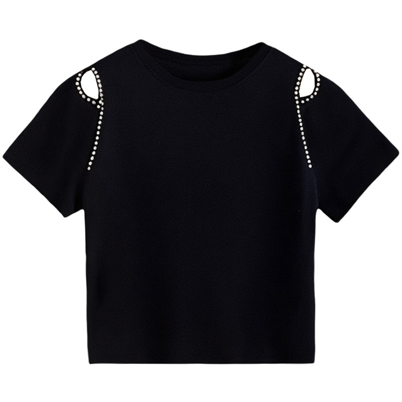 350斤胖莹莹大码女装设计感钉钻镂空炸街辣妹黑色百搭宽松短袖T恤