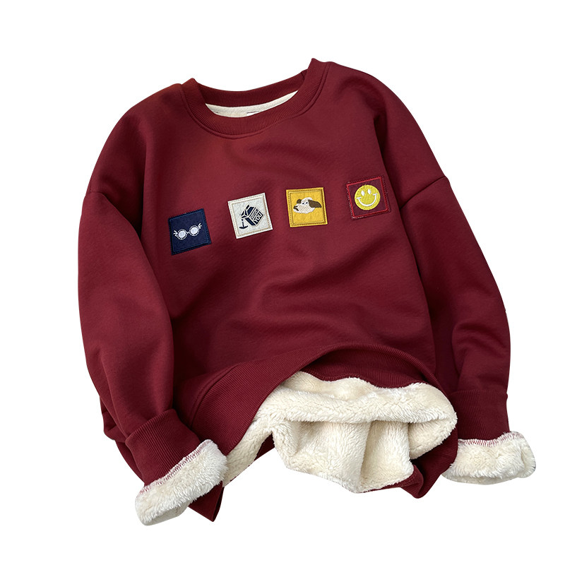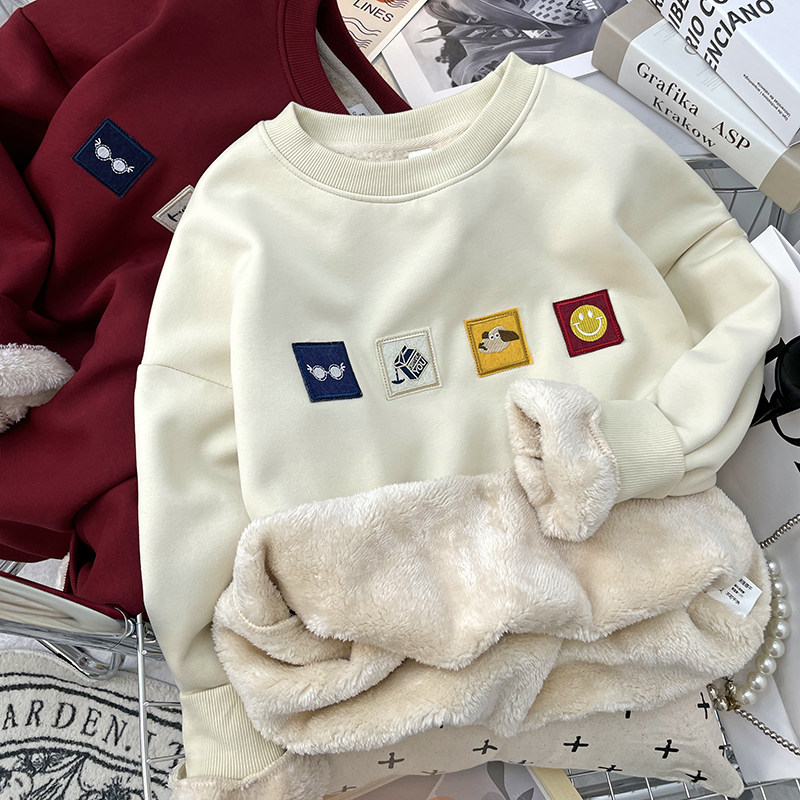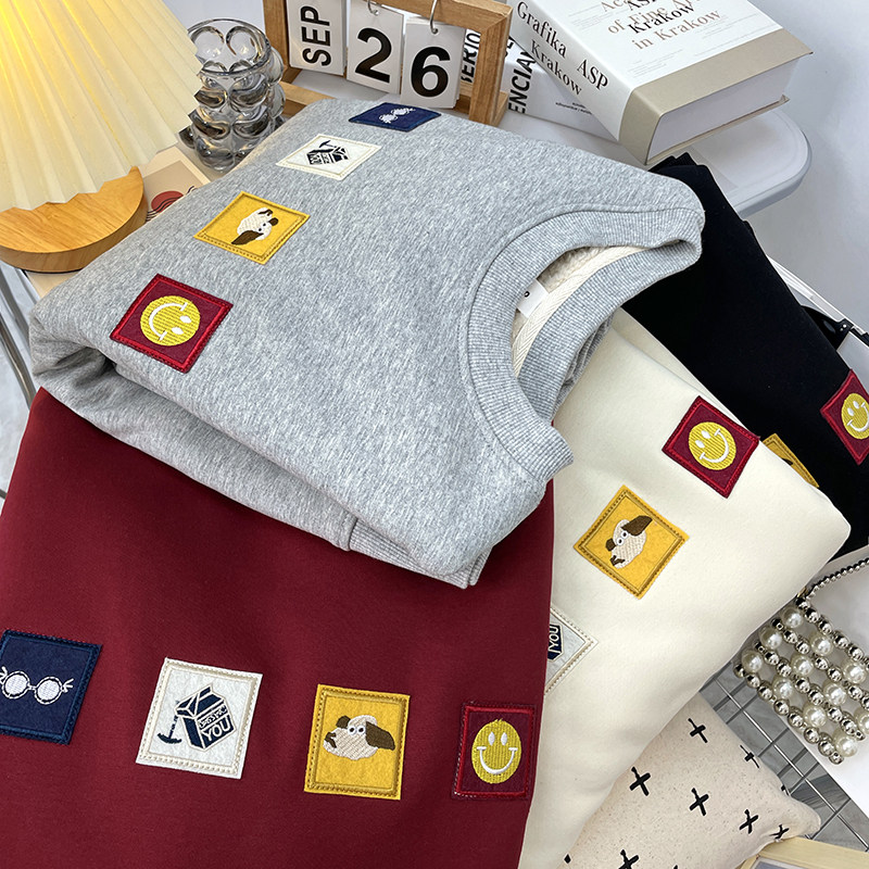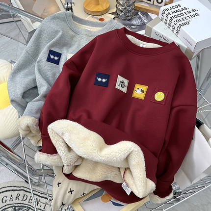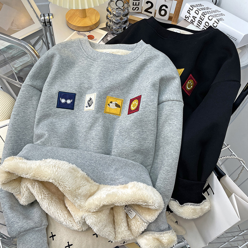 加绒加厚羊羔绒卫衣女秋冬装新款宽松圆领套头无帽绣花保暖打底衫