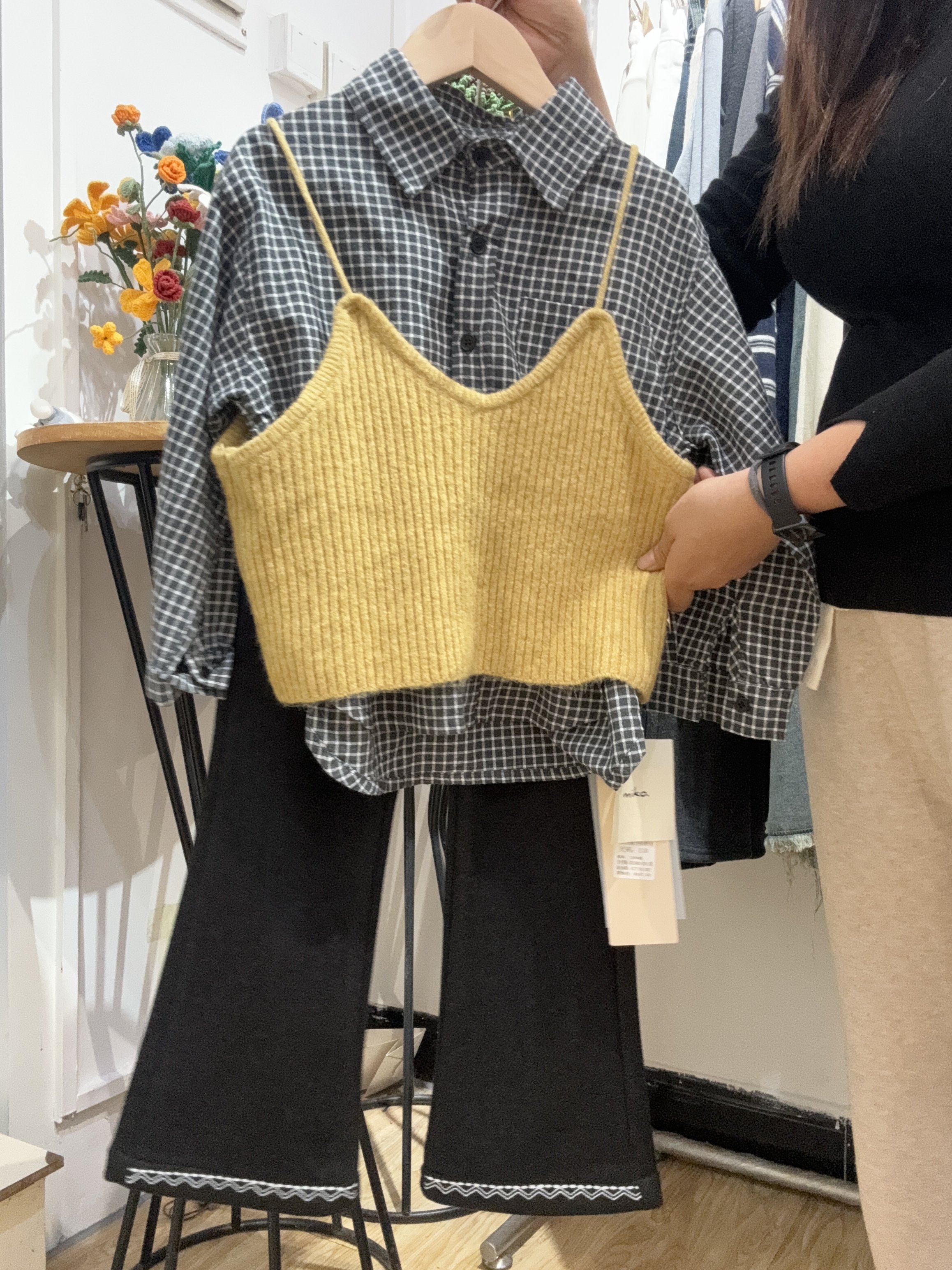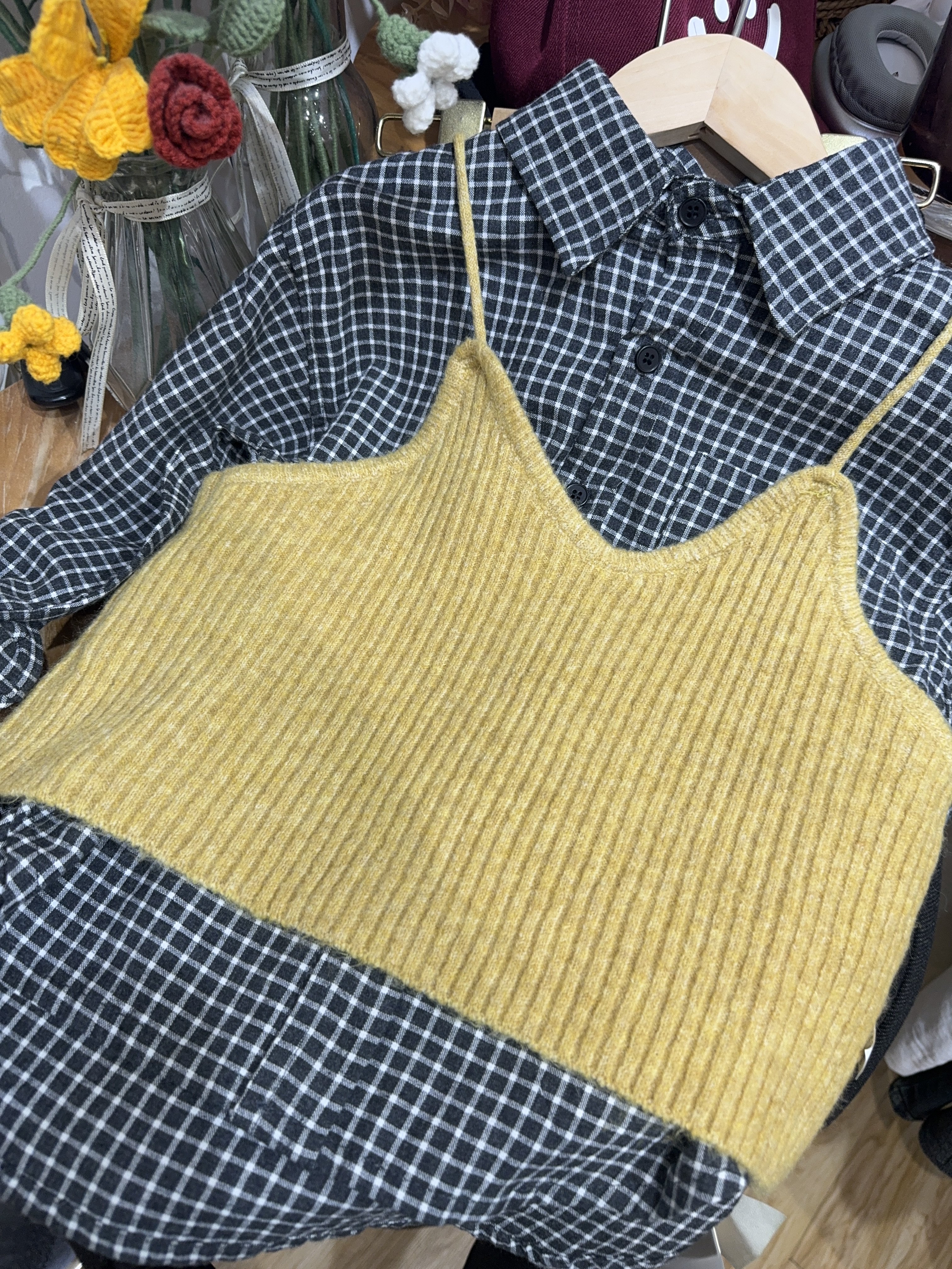 女大毛线吊带格子衬衫两件套童装套装儿童衣服春秋款女孩韩版套装