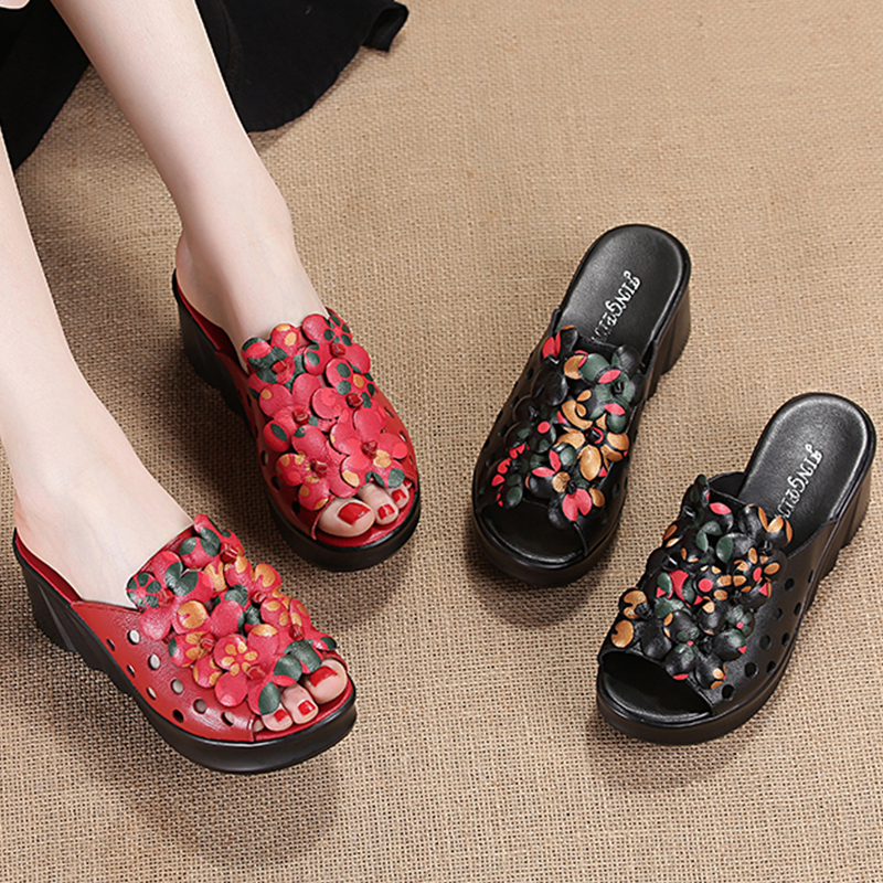 民族风拖鞋花朵女士凉鞋松糕厚底防水台复古高跟真皮坡跟镂空凉拖