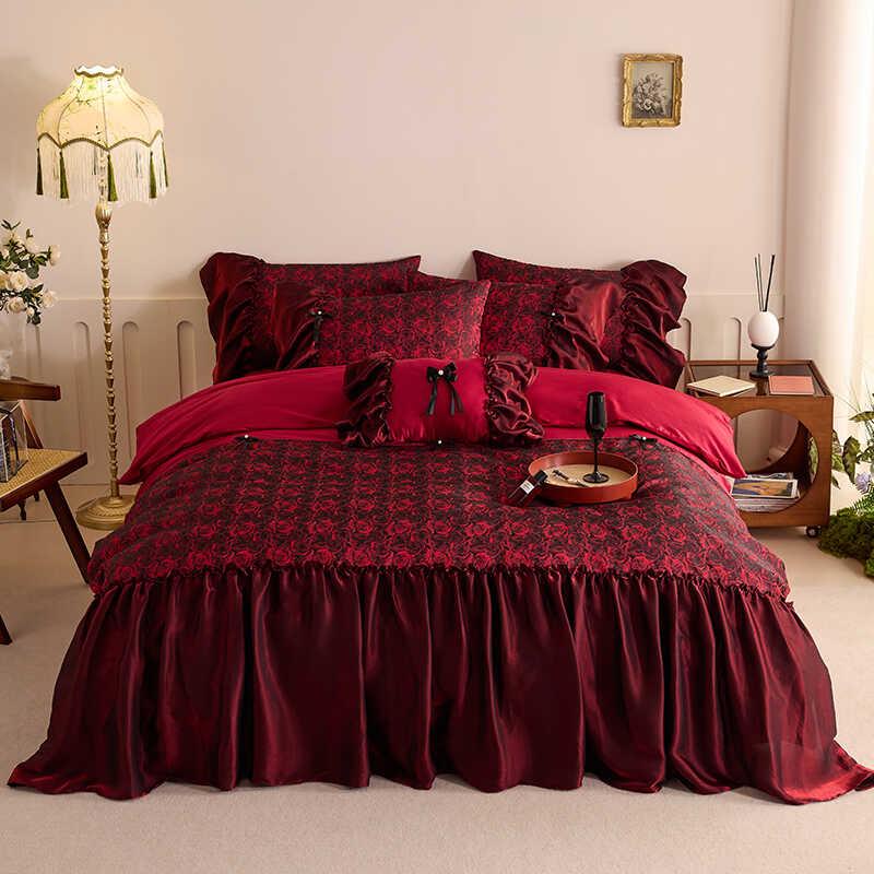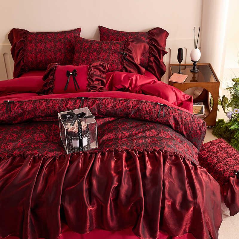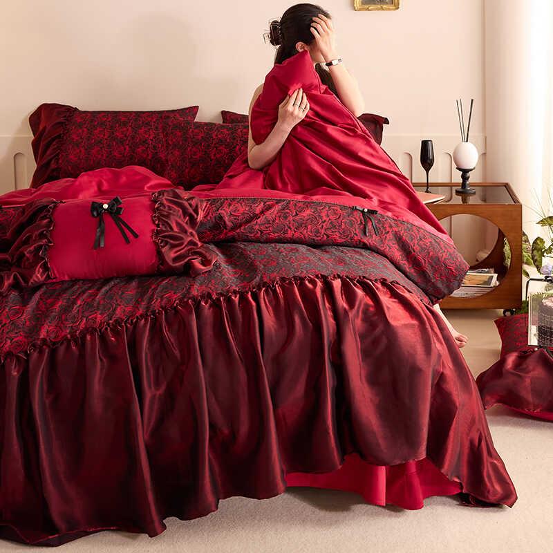 全棉提花玫瑰覆古结婚庆四件套长绒棉贡缎被套酒红公主风法式床品