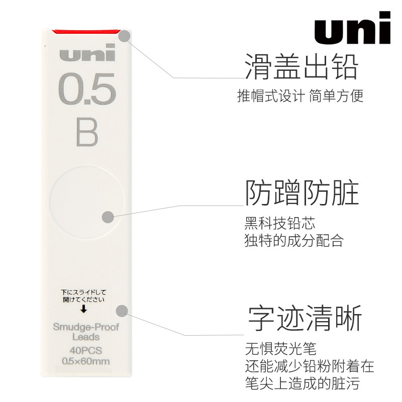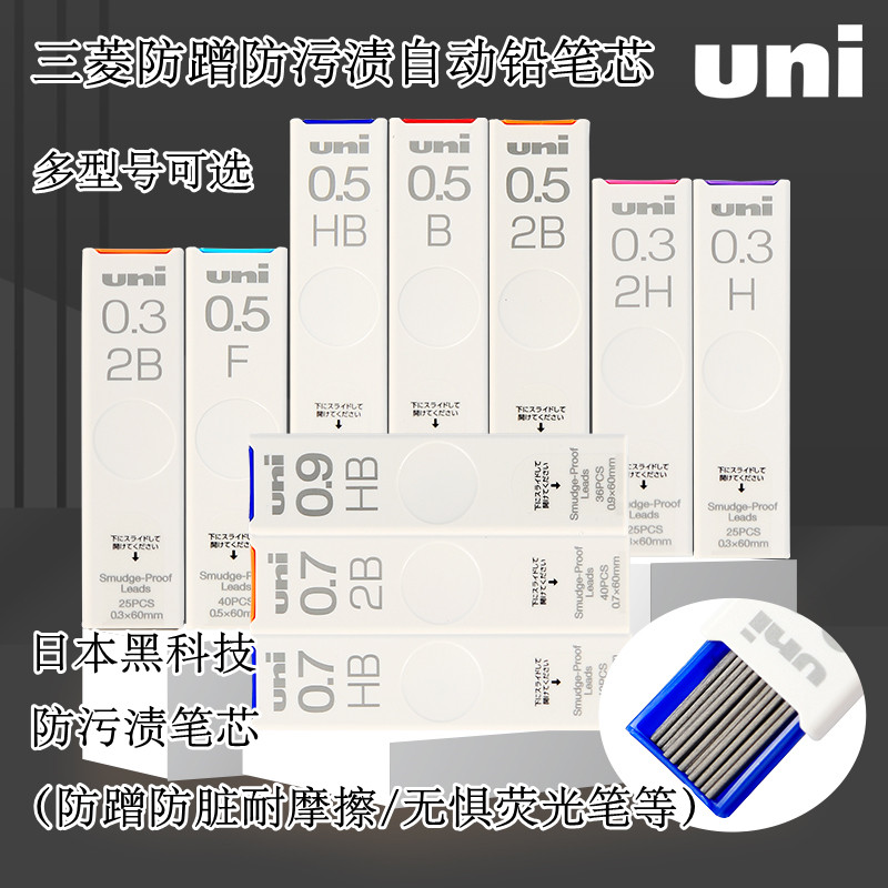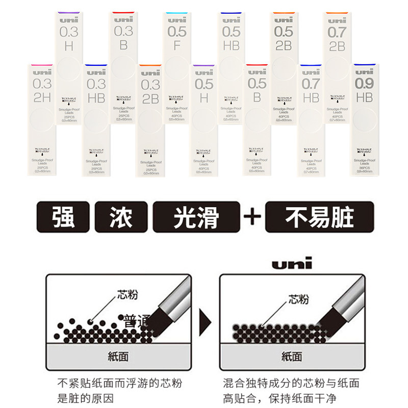 日本uni三菱自动铅笔芯UL-S防污防蹭脏0.5mm0.3mm0.7mm替芯Smudge Proof浓黑不晕染0.9mm4BHB2B2H不易断铅芯