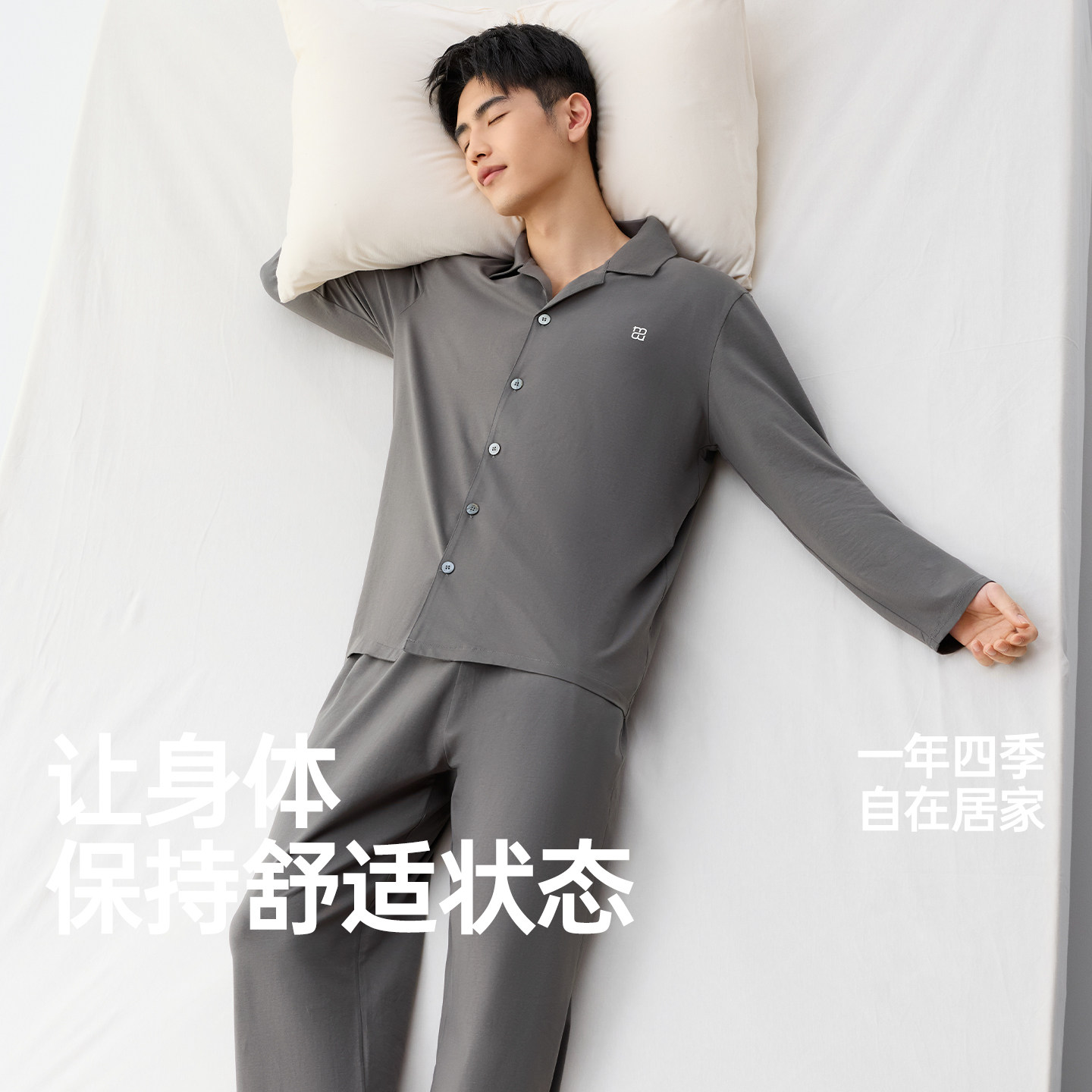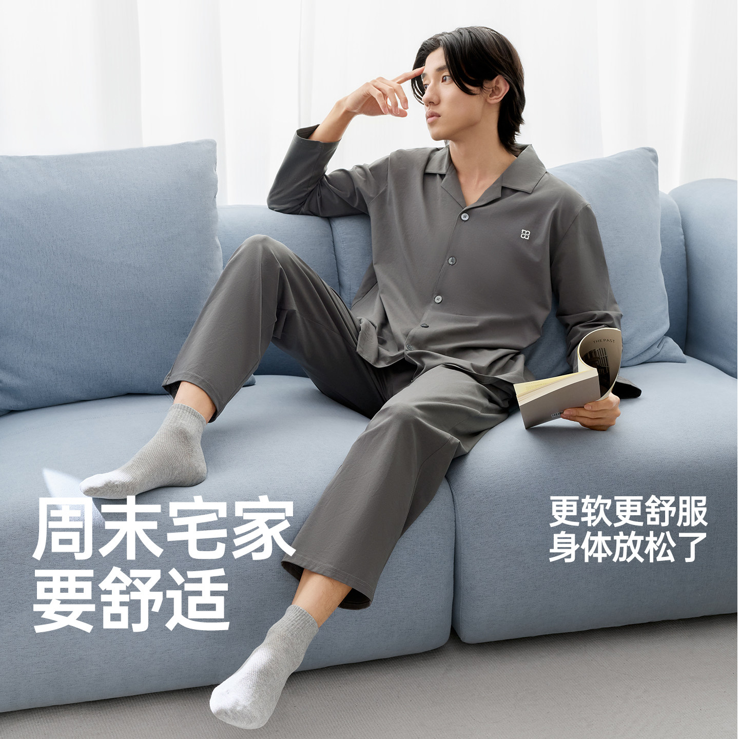 棉竹屋纯棉睡衣男士春夏季新疆棉简单家居服薄款翻领长袖睡裤套装