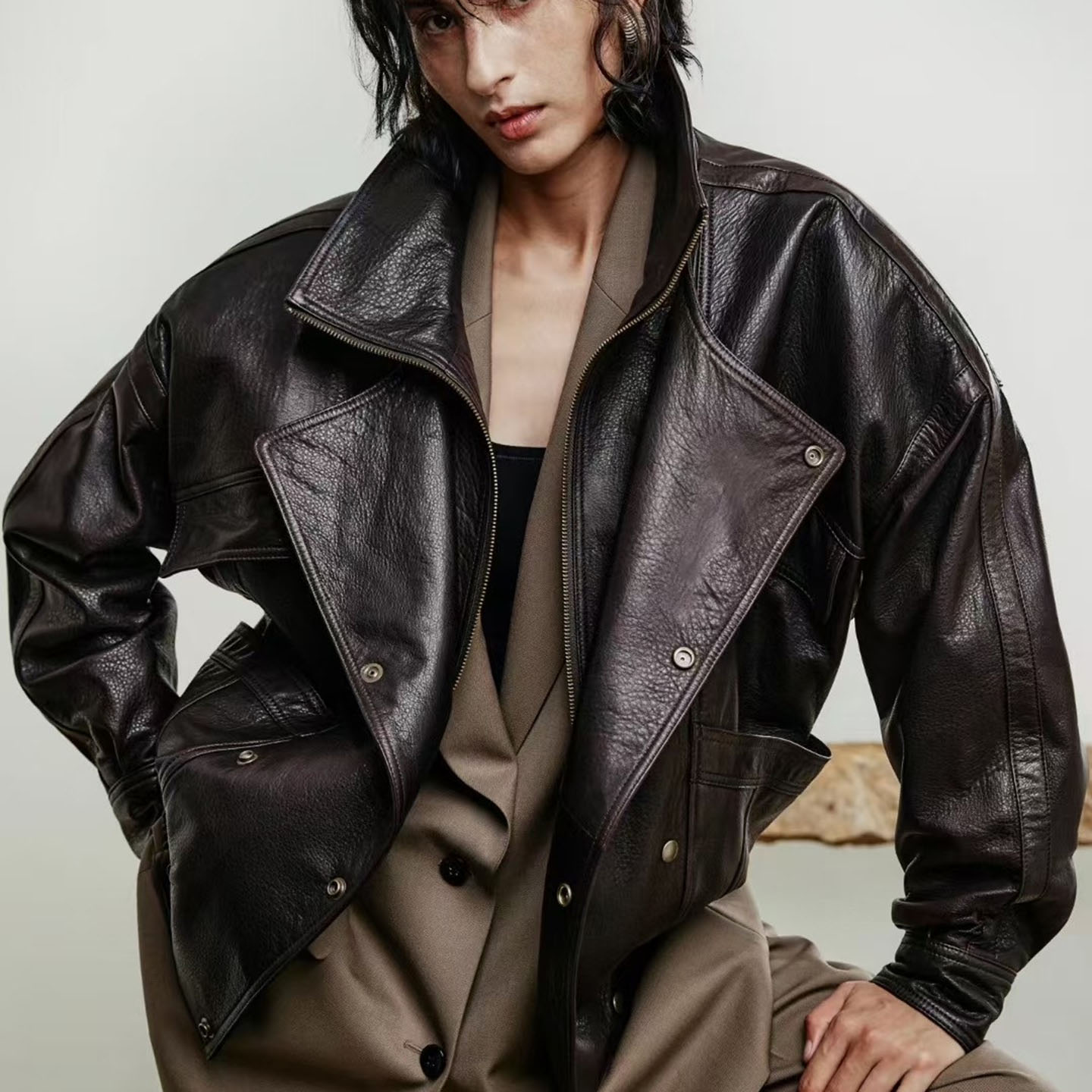 进口自然泡绵羊皮外套男女杨树林2025秋欧美高级机车真皮夹克皮衣