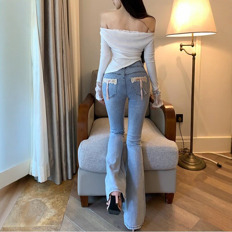 甜心蕾丝蝴蝶结设计微喇牛仔裤女