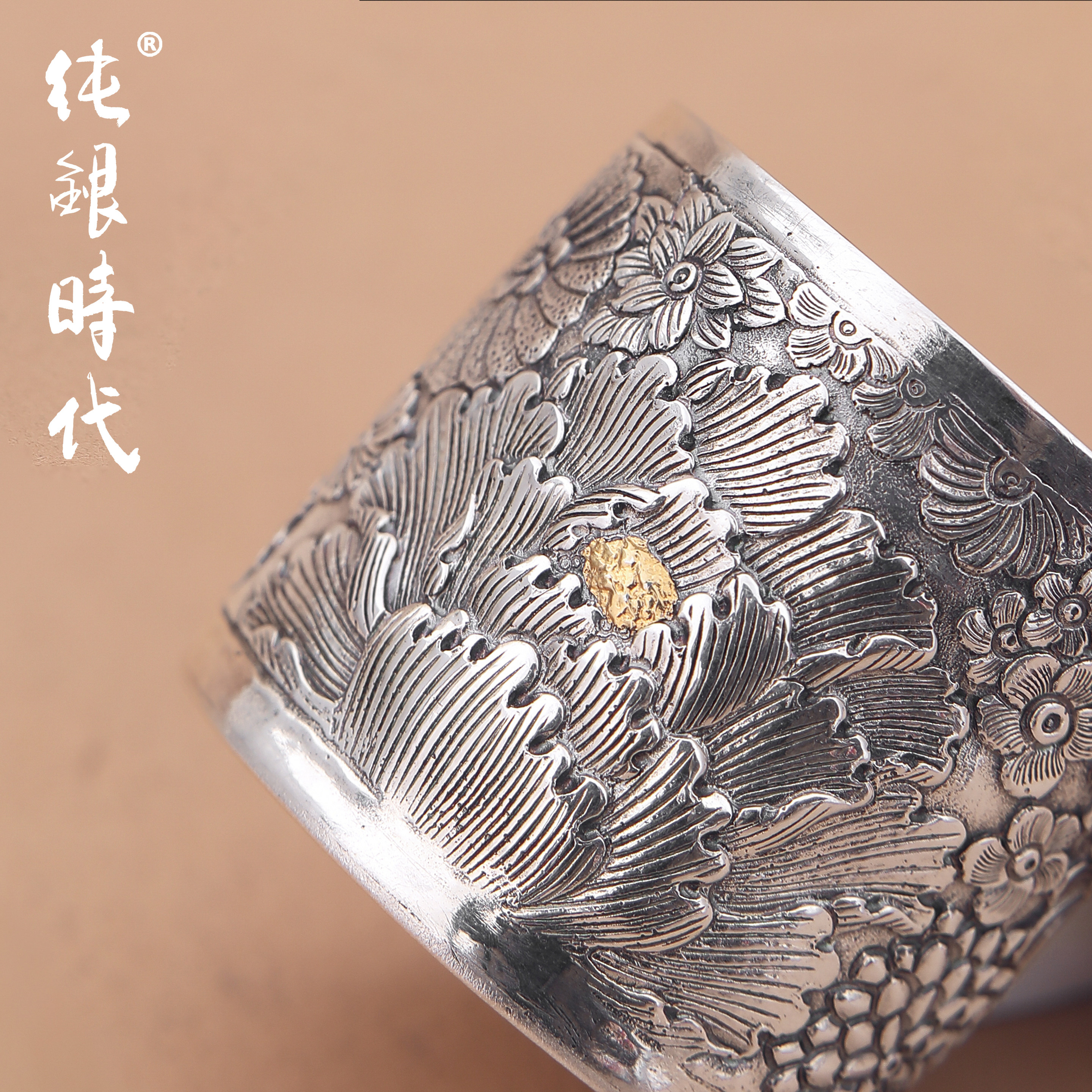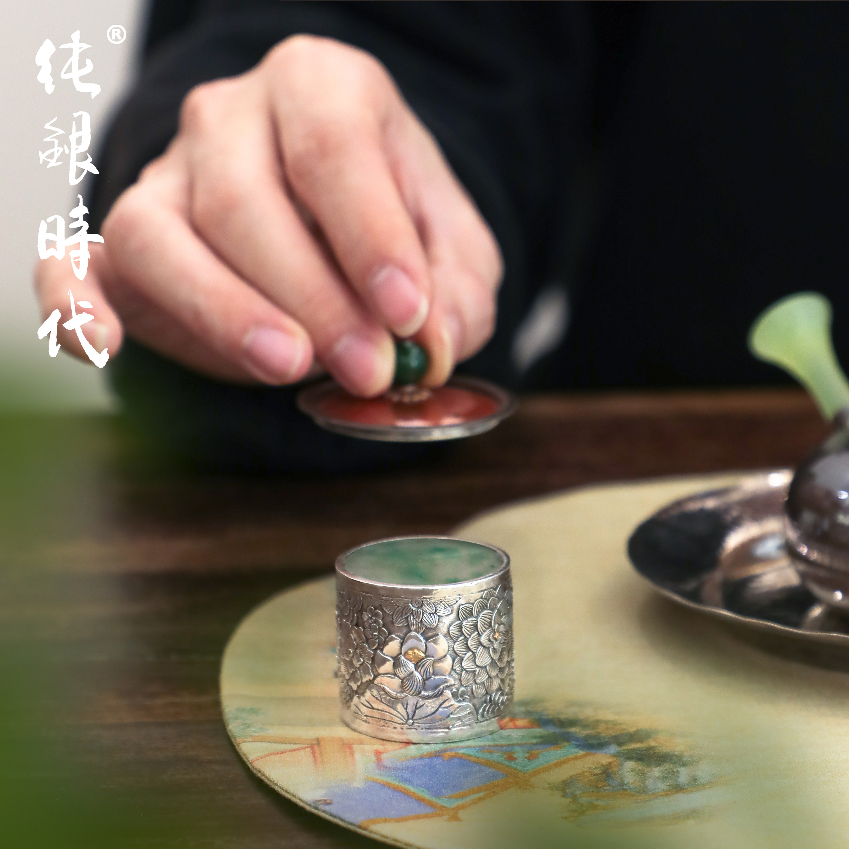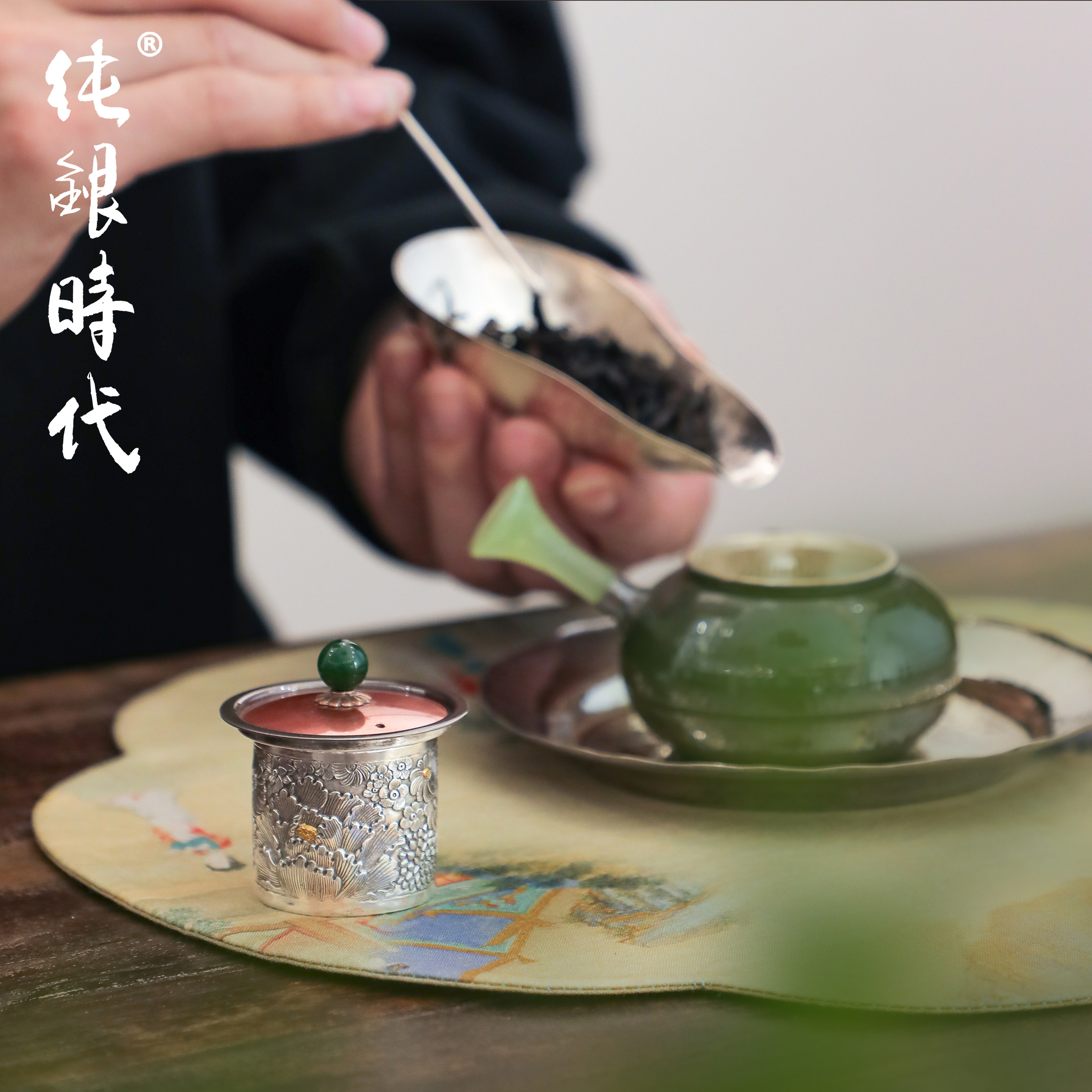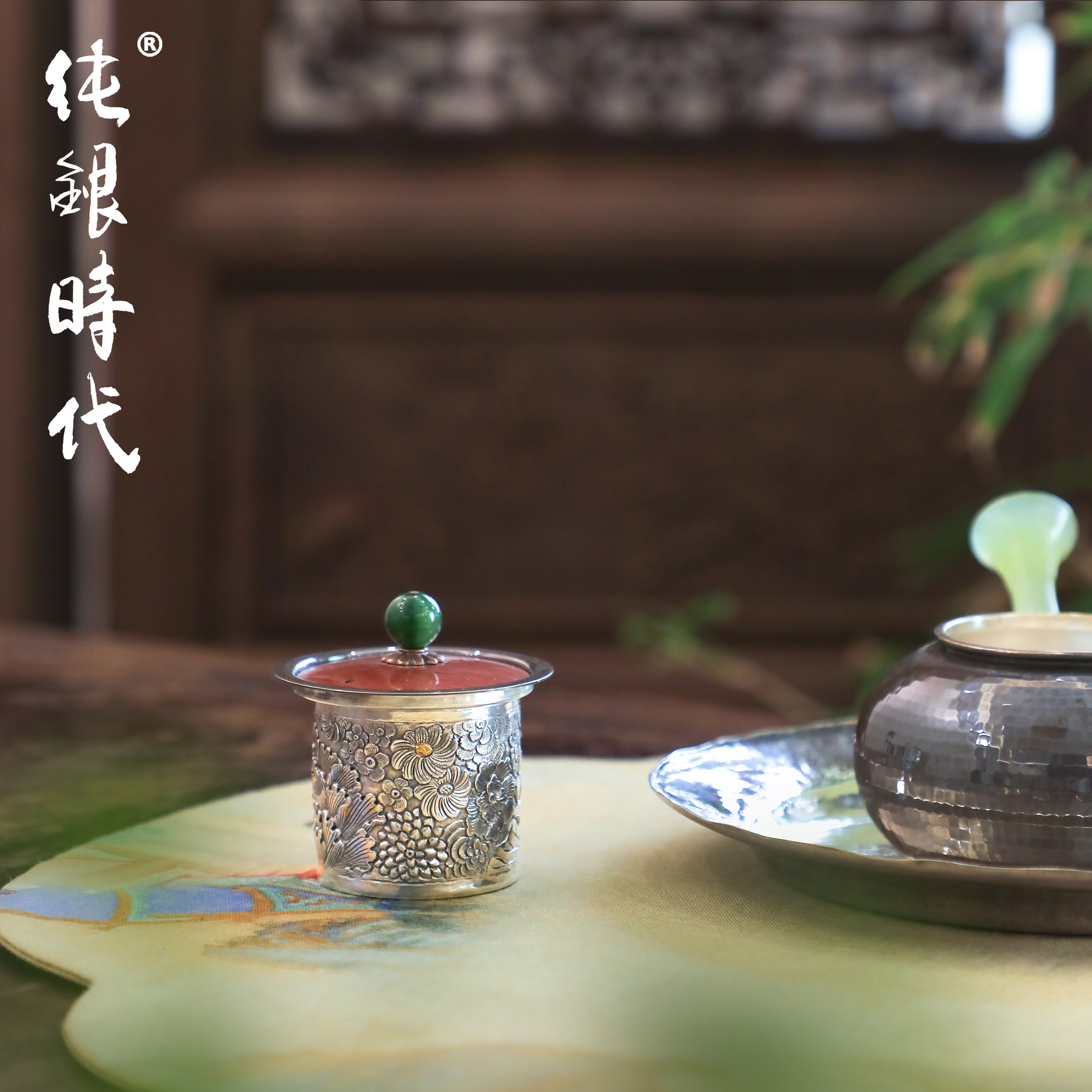 纯银时代 尘玉錾花盖置纯银999非遗手工錾刻茶席摆件茶道配件高端