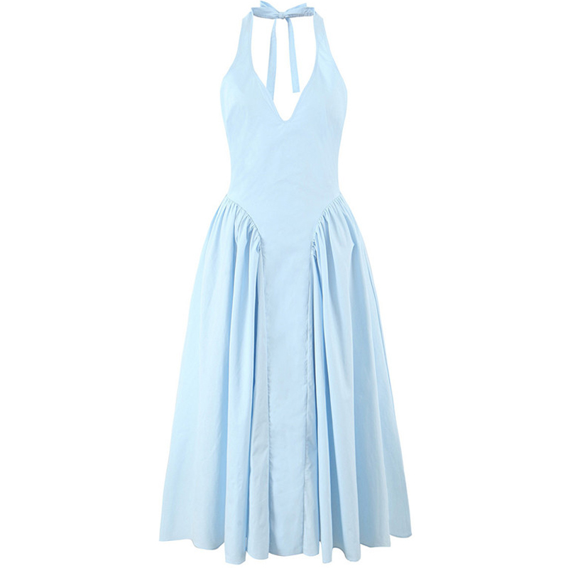 【包邮】法式复古蓝色挂脖系带长款连衣裙女夏季性感露背大裙摆裙