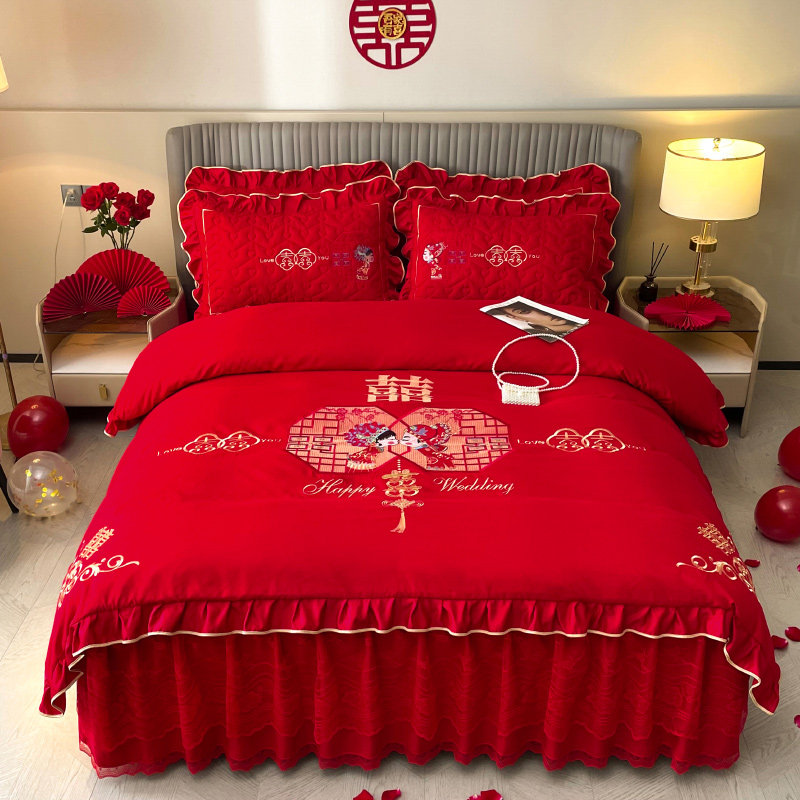 婚庆水洗棉喜庆四件套中式大红色床单刺绣被套结婚房床上用品