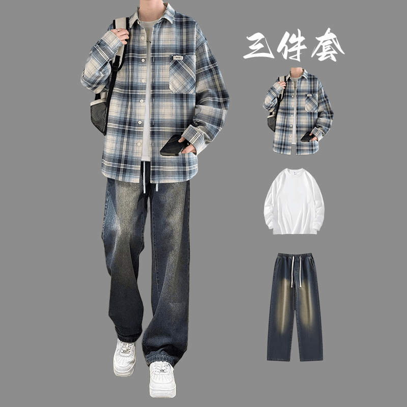 春秋季格子外套男青少年高中学生夹克男装一整套休闲套装长袖衬衫
