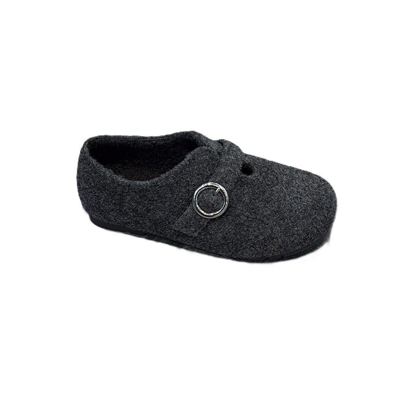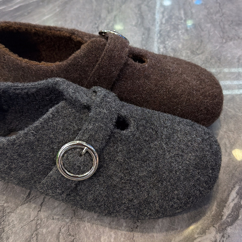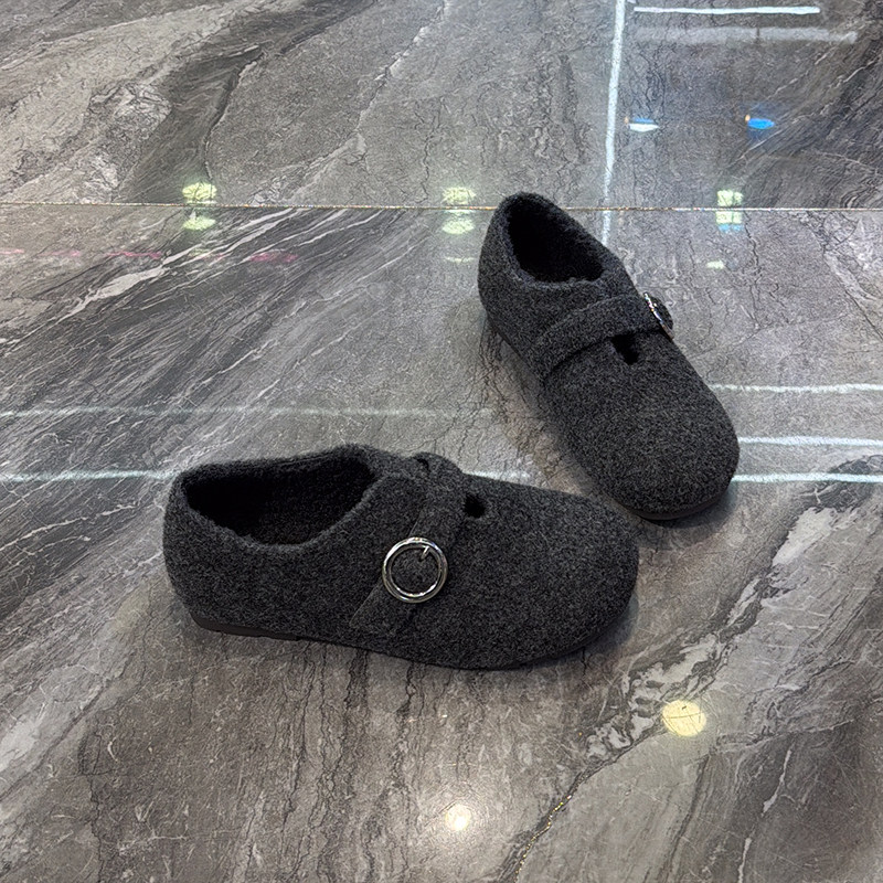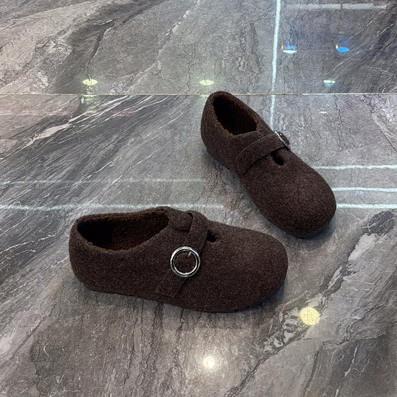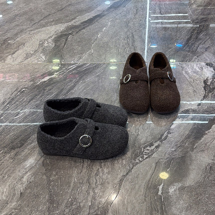 超软毛呢内增高加绒勃肯鞋女2025冬新款洋气皮带扣圆头平底乐福鞋