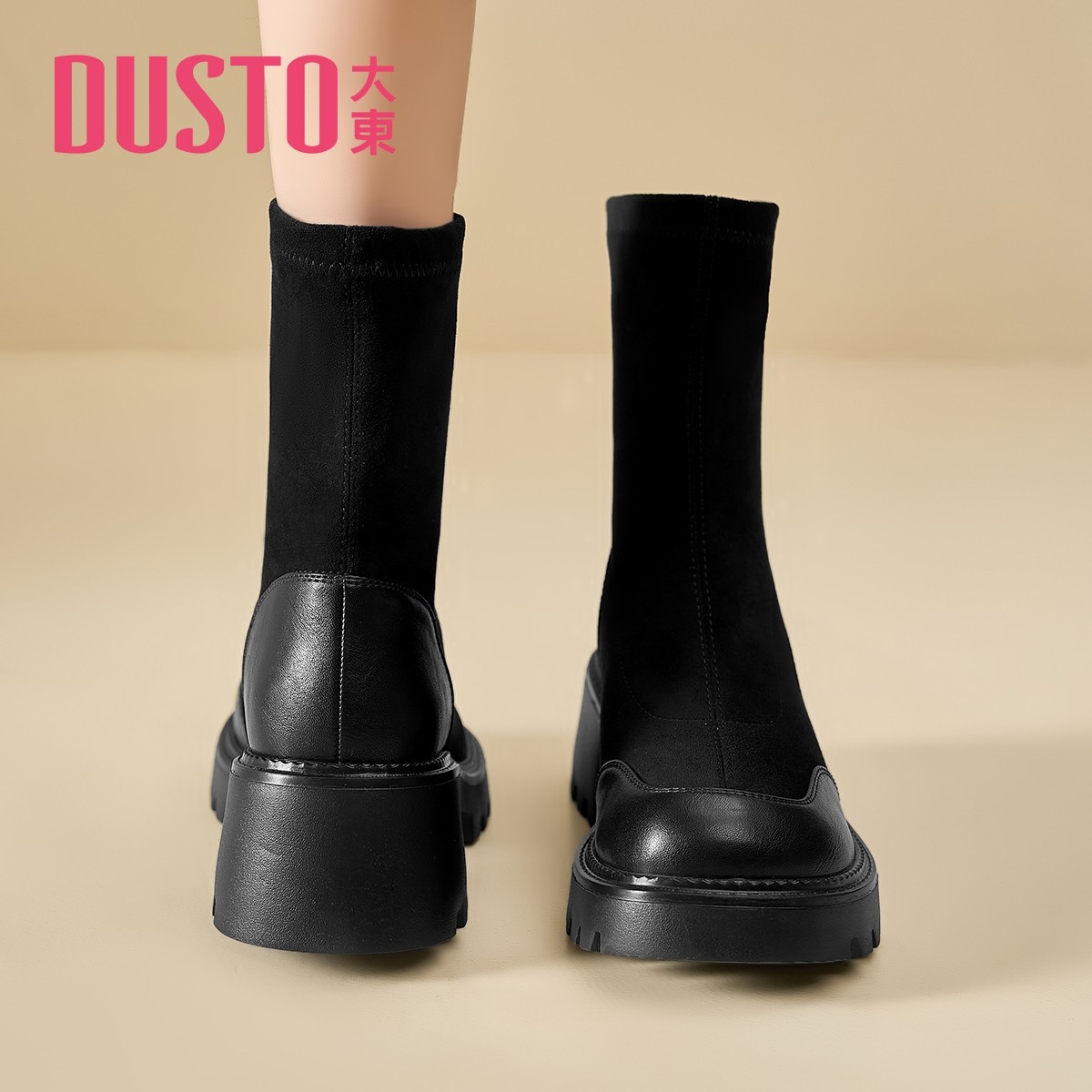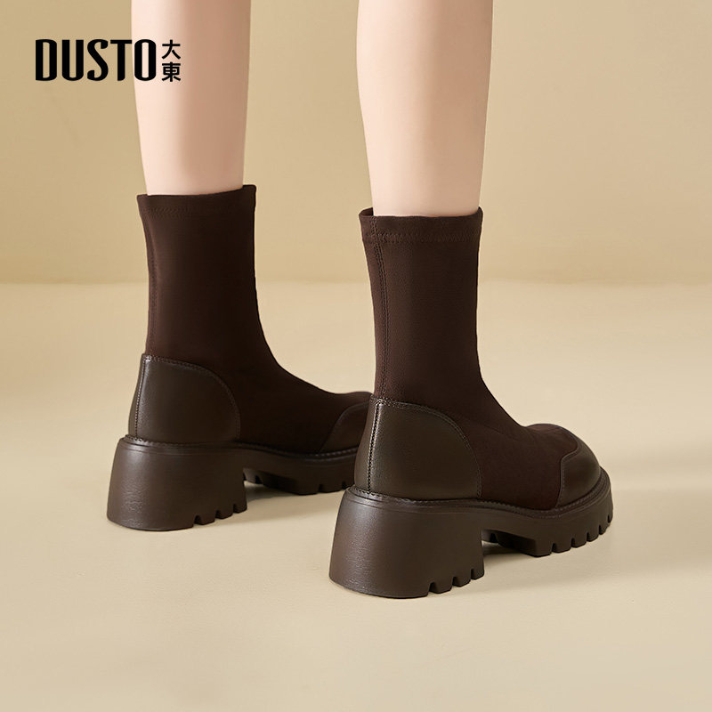大东美拉德短靴女2026新款秋冬季粗跟厚底棕色靴子弹力瘦瘦靴袜靴