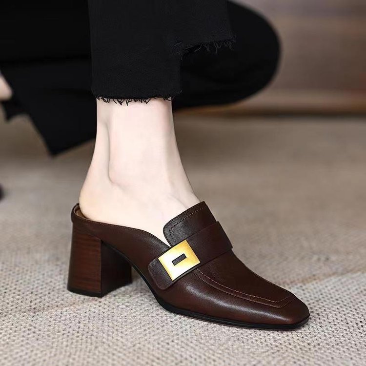 复古棕色英伦风包头粗跟高跟拖鞋女外穿气质软皮一脚蹬方头小皮鞋