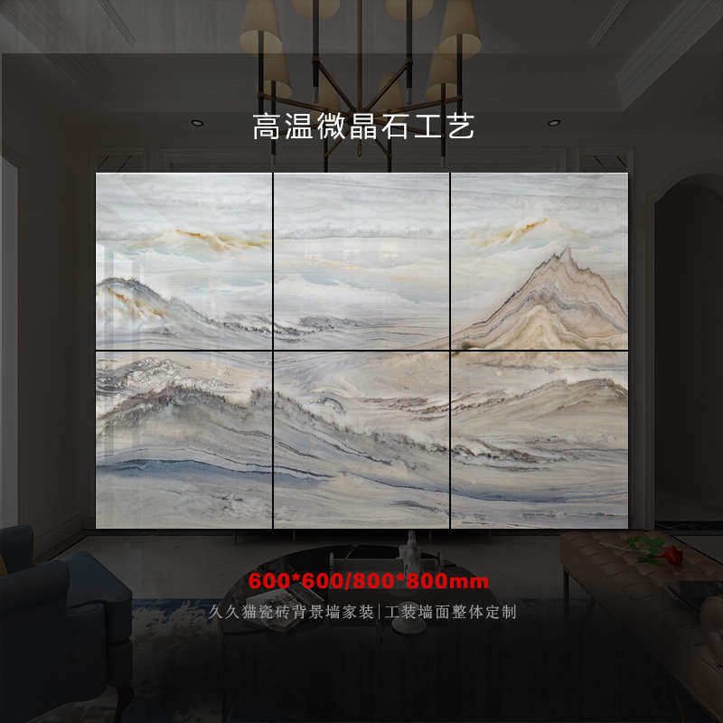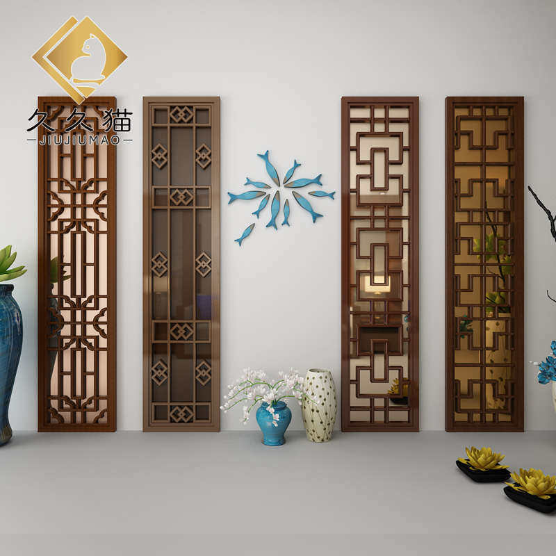中式微晶石瓷砖背景墙客厅电视墙胡桃实木花格护墙板橡木边框定制