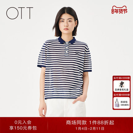 OTT【商场同款】2025夏季新品polo领条纹毛织T恤女时髦显瘦针织衫
