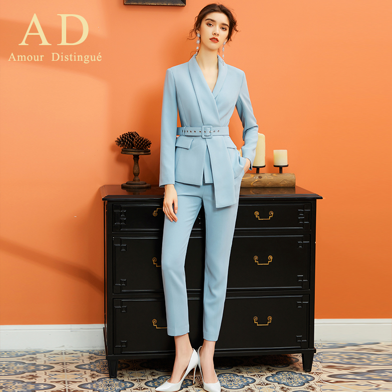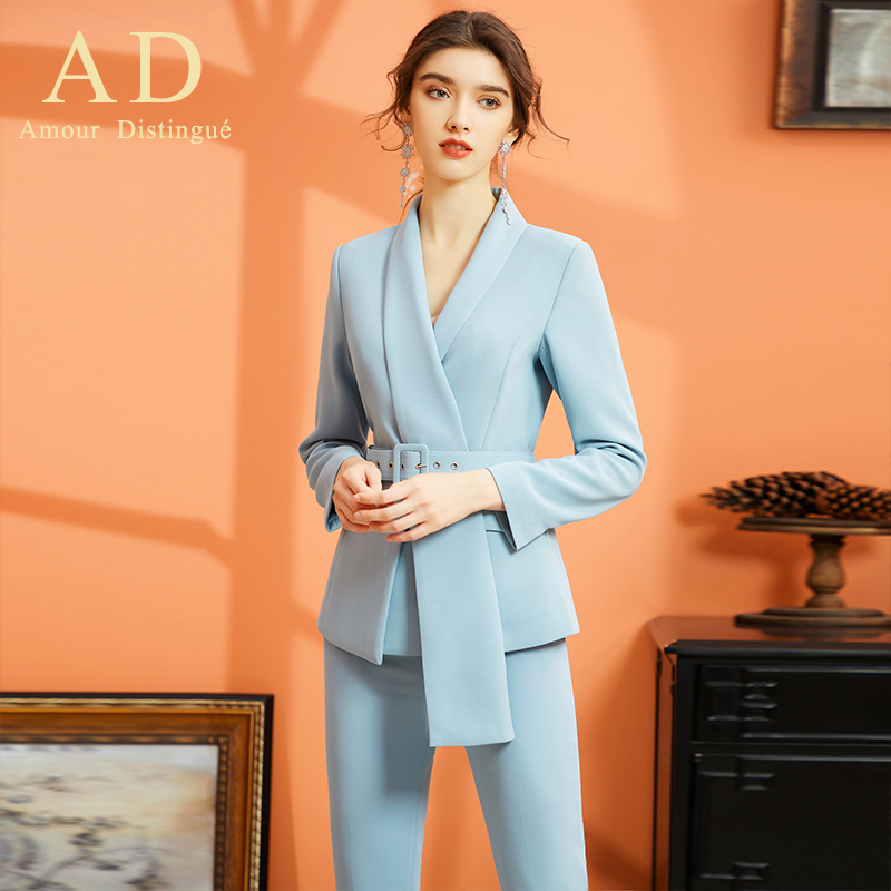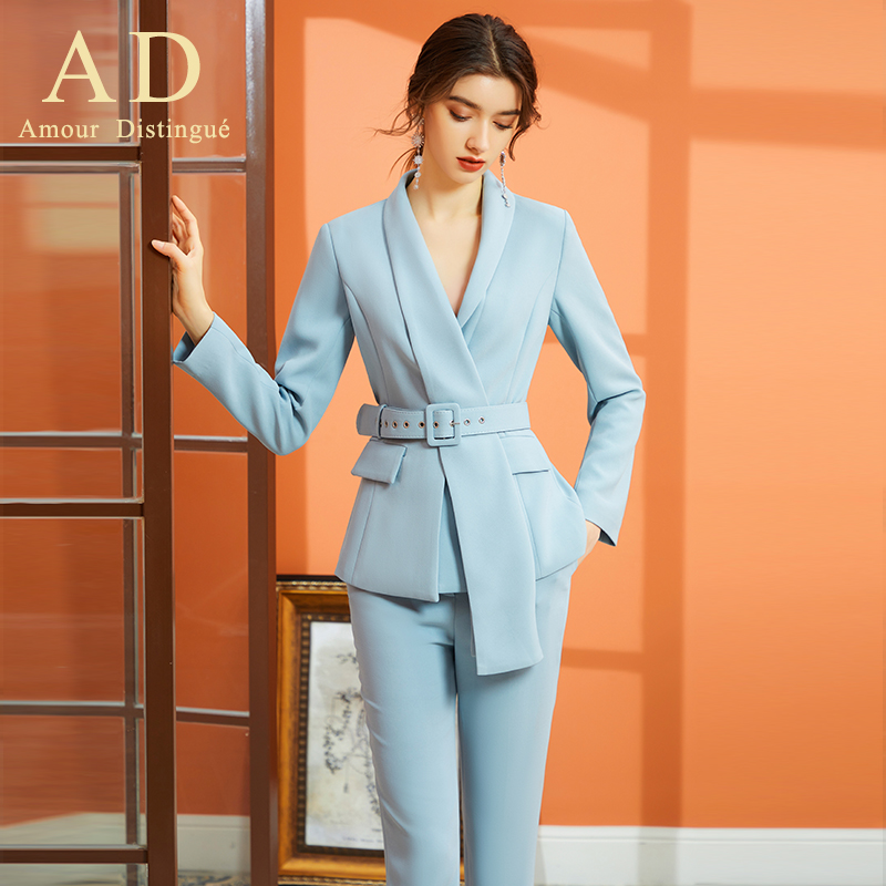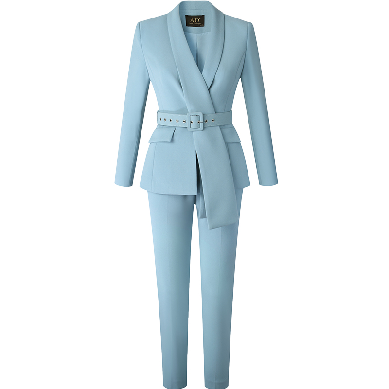 AD时尚天蓝色修身系带西装套装春秋季名媛气质设计感职业装OL正装