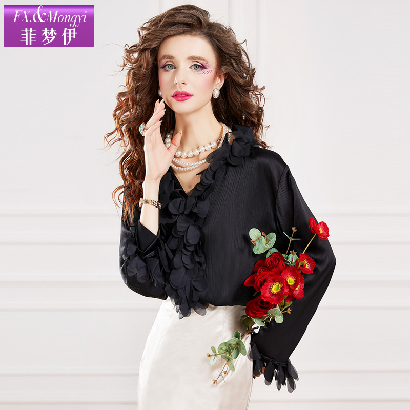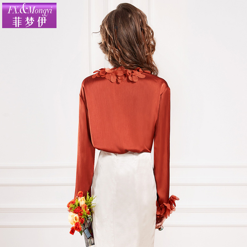 菲梦伊花朵荷叶边白色衬衫女长袖秋装垂感顺滑设计感小众气质上衣