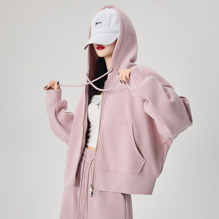 粉色拉链连帽卫衣女春秋小个子韩版宽松显瘦上衣外套秋冬百搭上衣