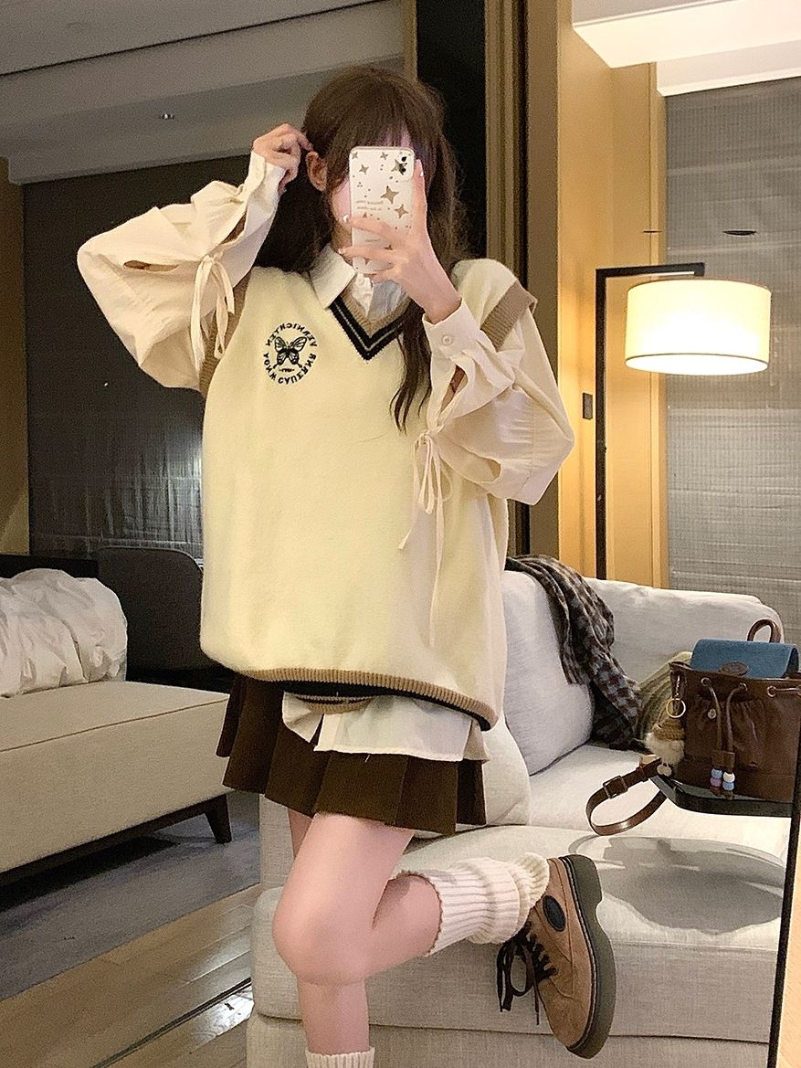 学院风甜美蝴蝶刺绣针织V领马甲背心毛衣女学生+绑带衬衫两件套装