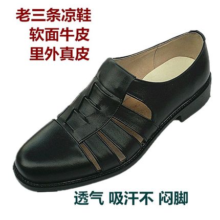 头层软牛皮老三条皮凉鞋真皮中老年爸爸鞋洞洞鞋商务镂空透气男鞋