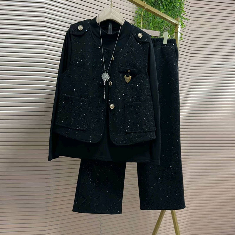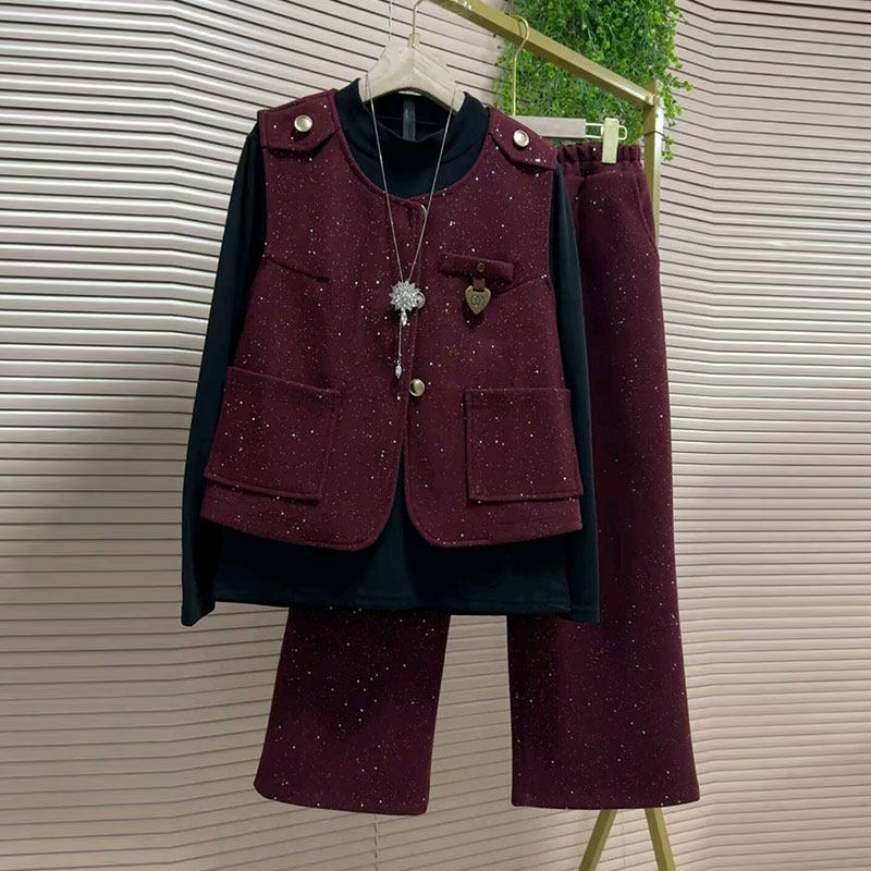 欧版复古套装胖妹妹大码女装时尚名媛气质毛呢马甲裤子打底三件套