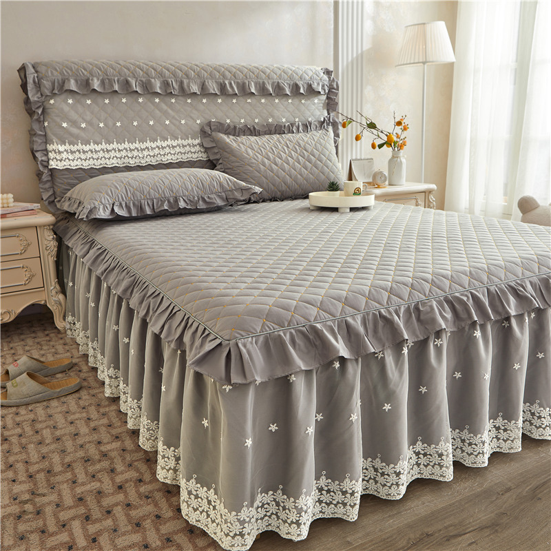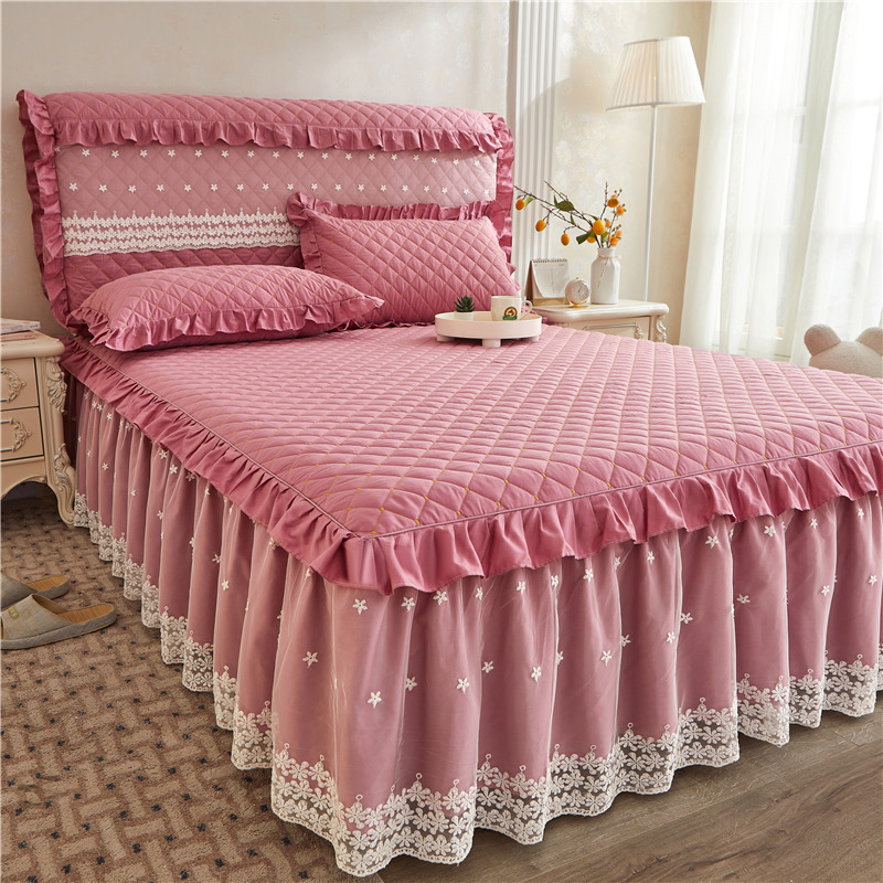 全棉蕾丝夹棉床裙加厚纯棉床罩公主被套枕套纯色绗缝床头罩可定制