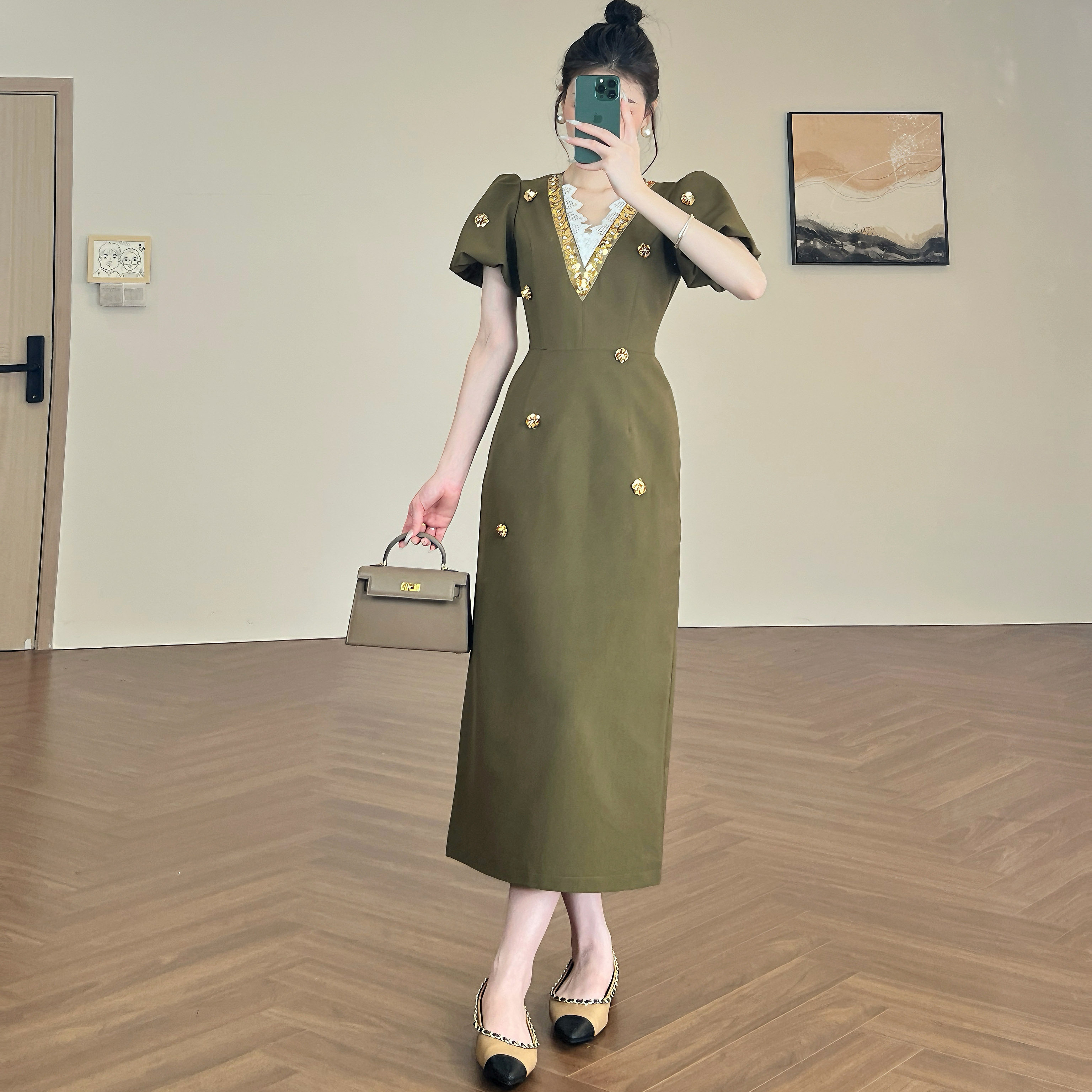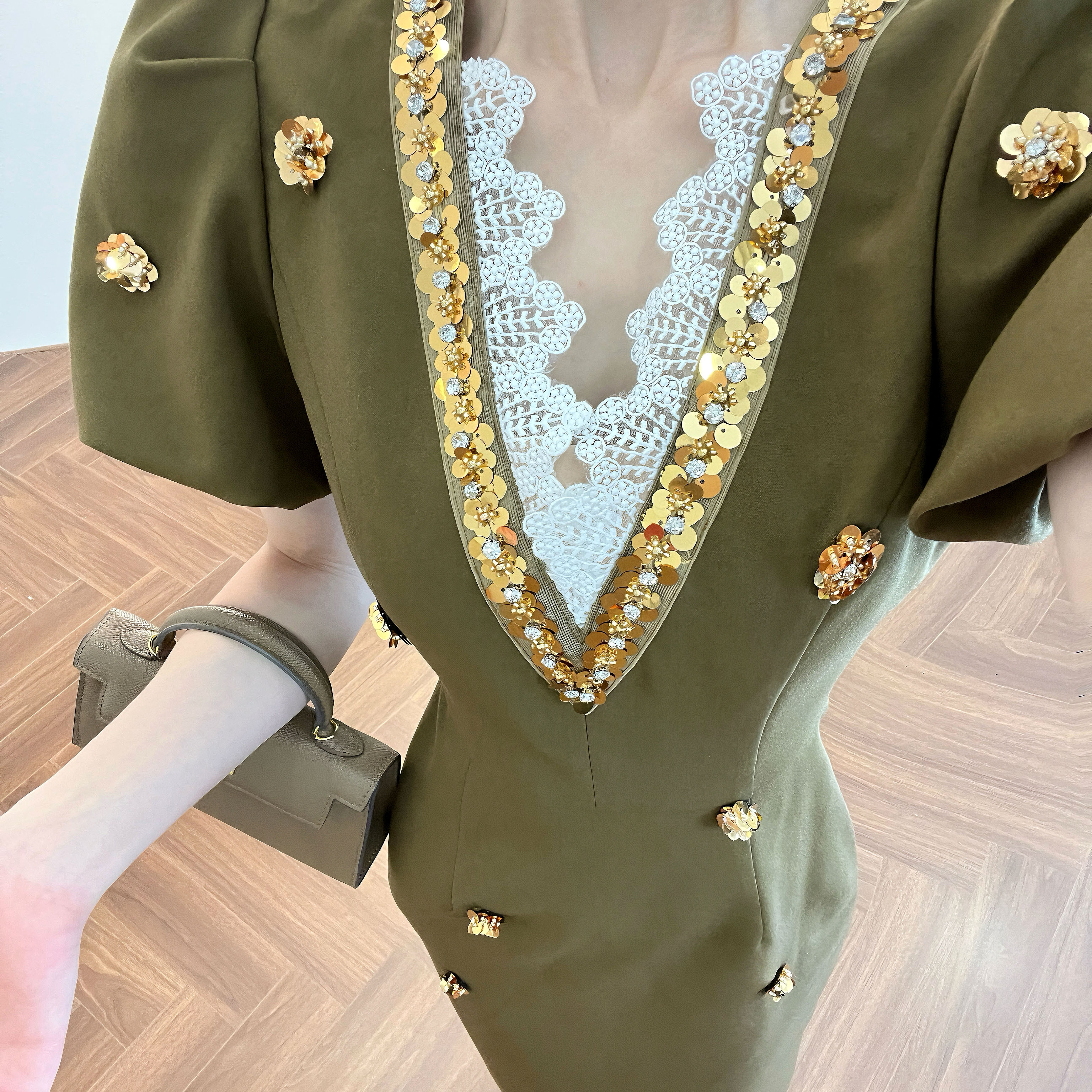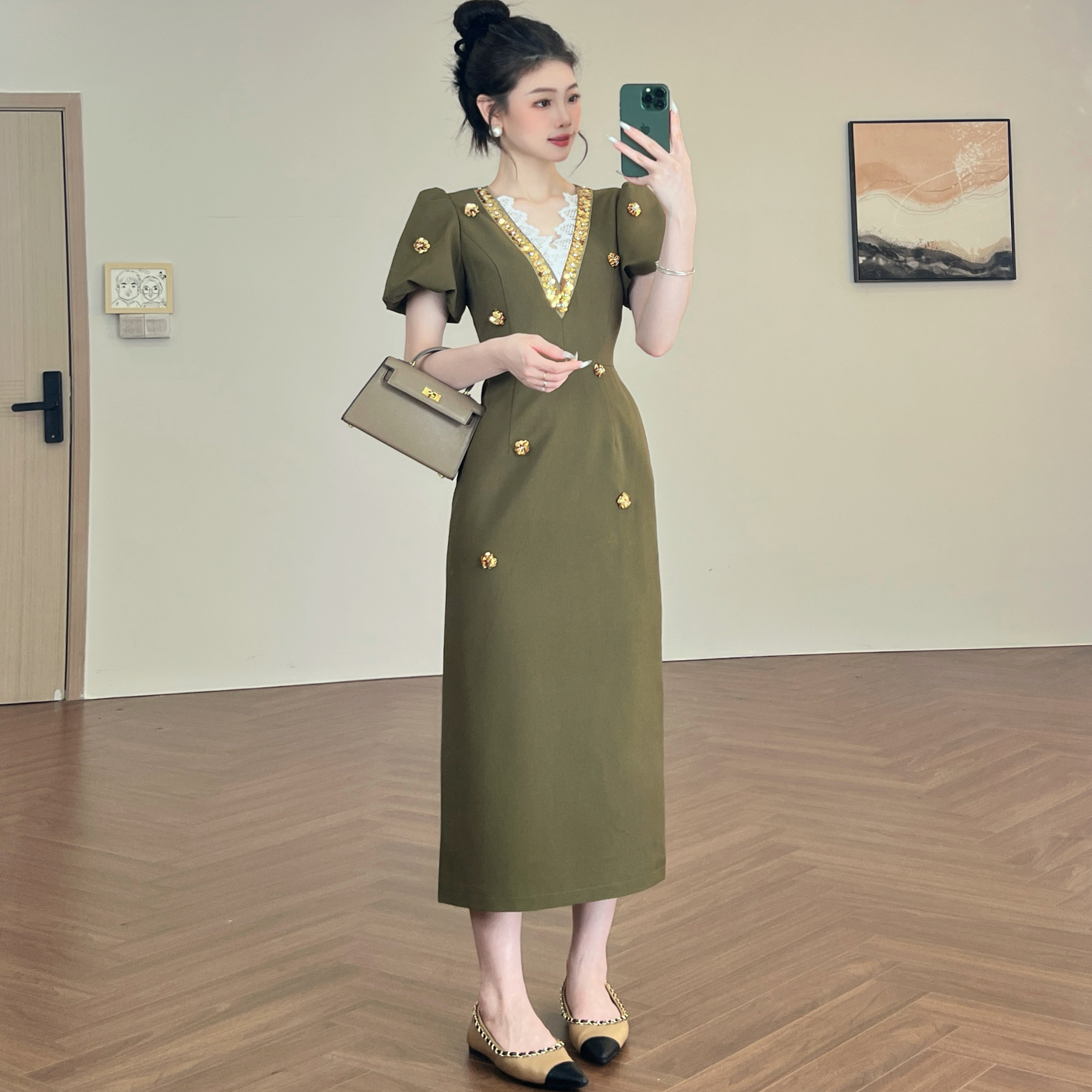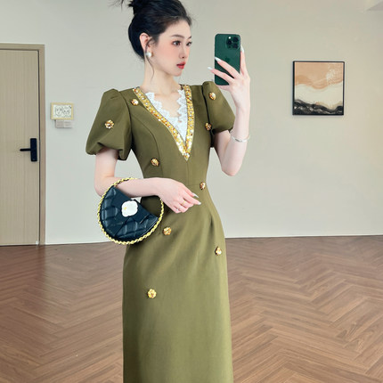 绿色高级感重工定制V领连衣裙女夏季2025年新款气质立体花朵裙子