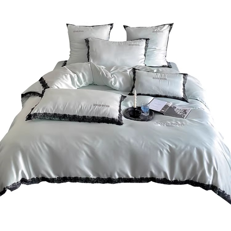 春夏轻奢80支兰精天丝四件套高端蕾丝刺绣被套床上用品绿粉白色