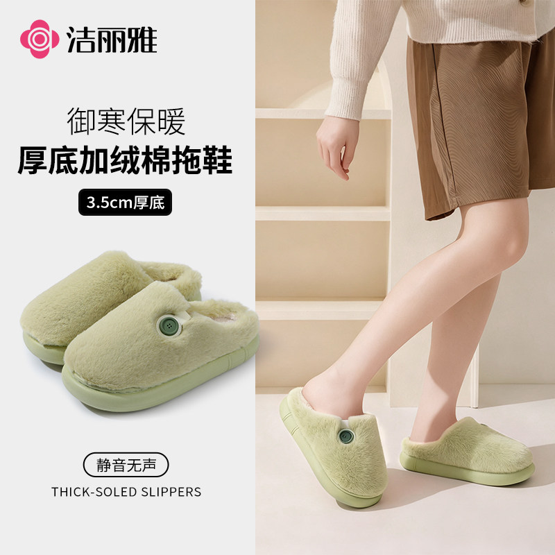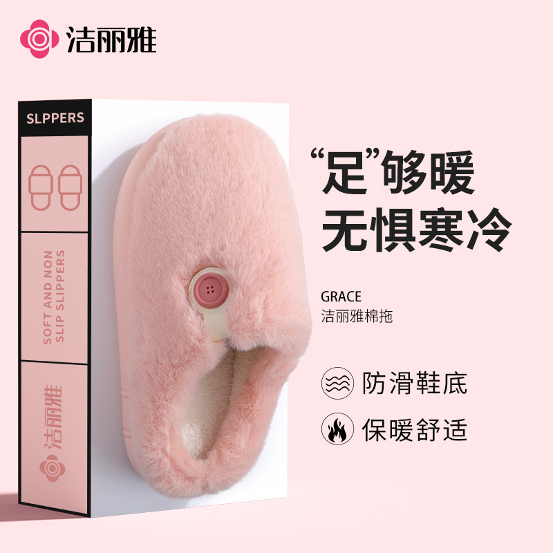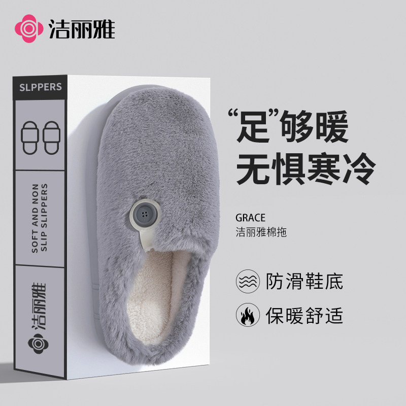 洁丽雅冬季爆款简约高颜值保暖防滑男女款棉拖鞋
