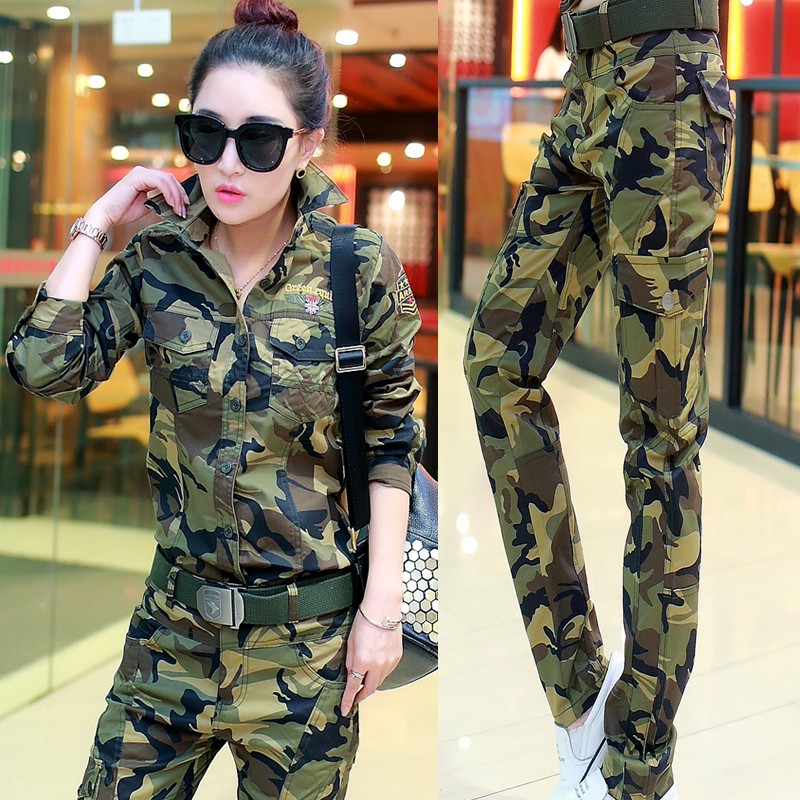 2023新款春秋迷彩套装女短袖工装多口袋弹力裤 时尚军绿衬衣长袖