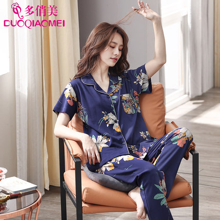睡衣女夏季薄款纯棉短袖长裤两件套装全棉大码新款春夏天居家居服
